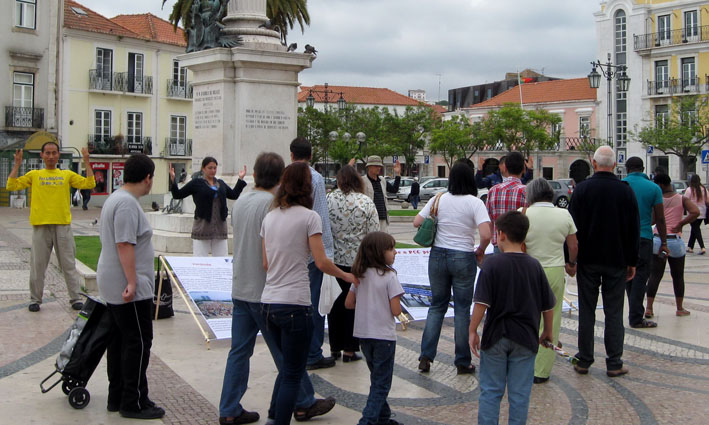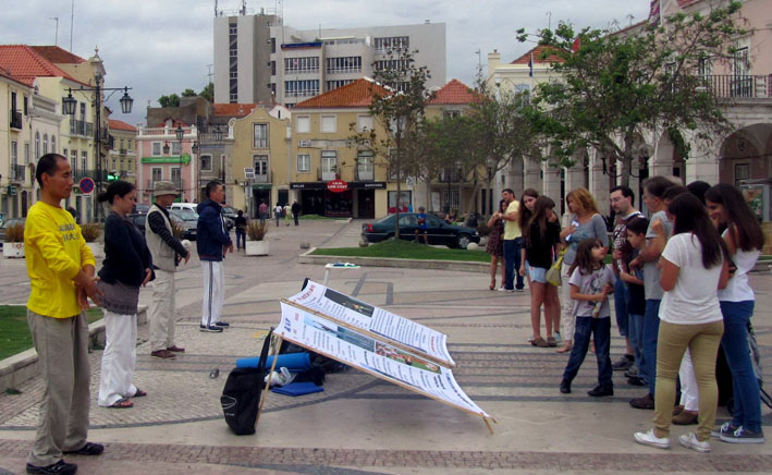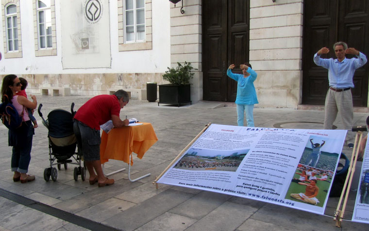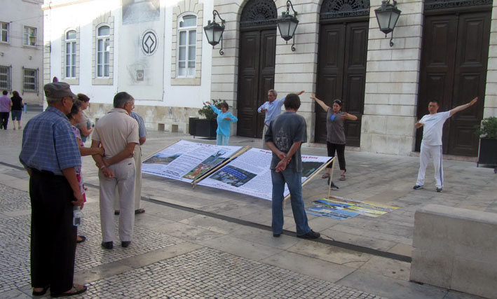 在首都里斯本,学员们在市政府外的市中心广场上拉开真相展板,演示功法,介绍法轮功。少数学员派发真相传单,给市民们讲十四年来中共邪*党-残酷迫害法轮功的真相,特别是活摘器官的真相。