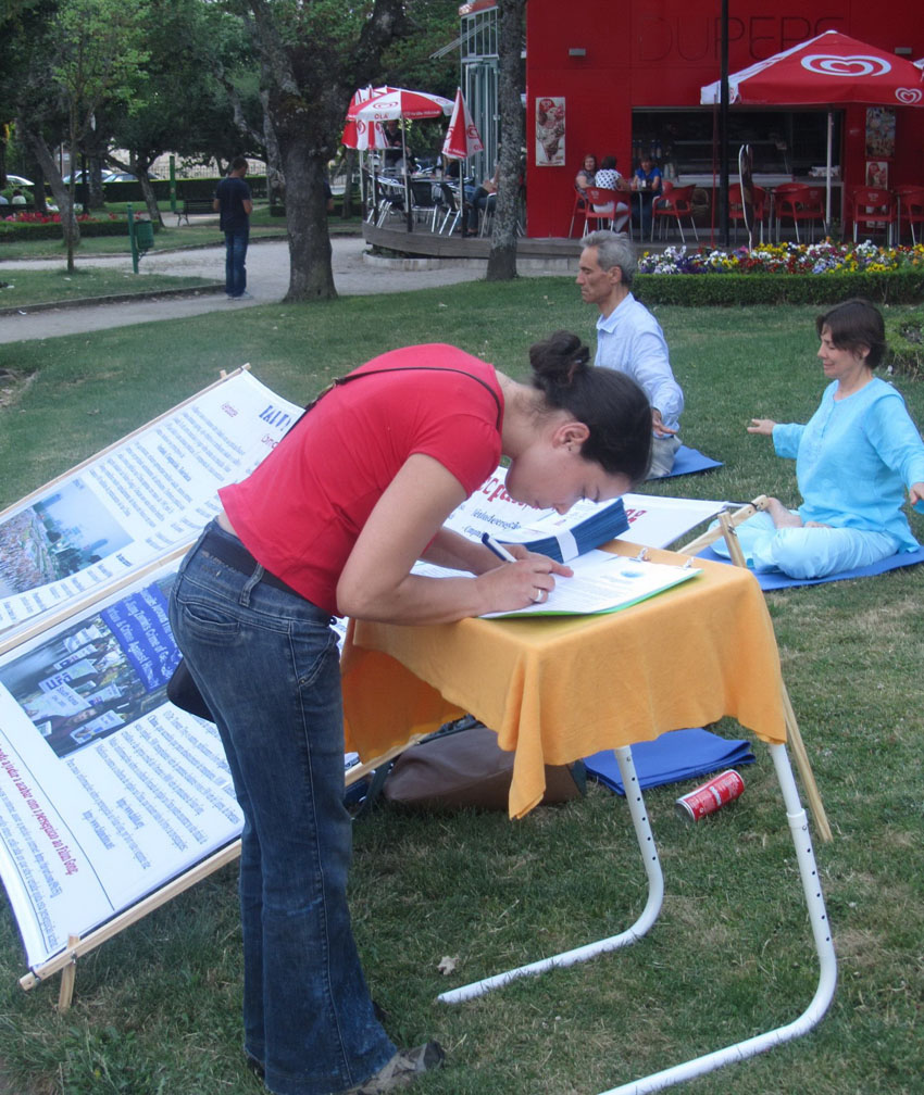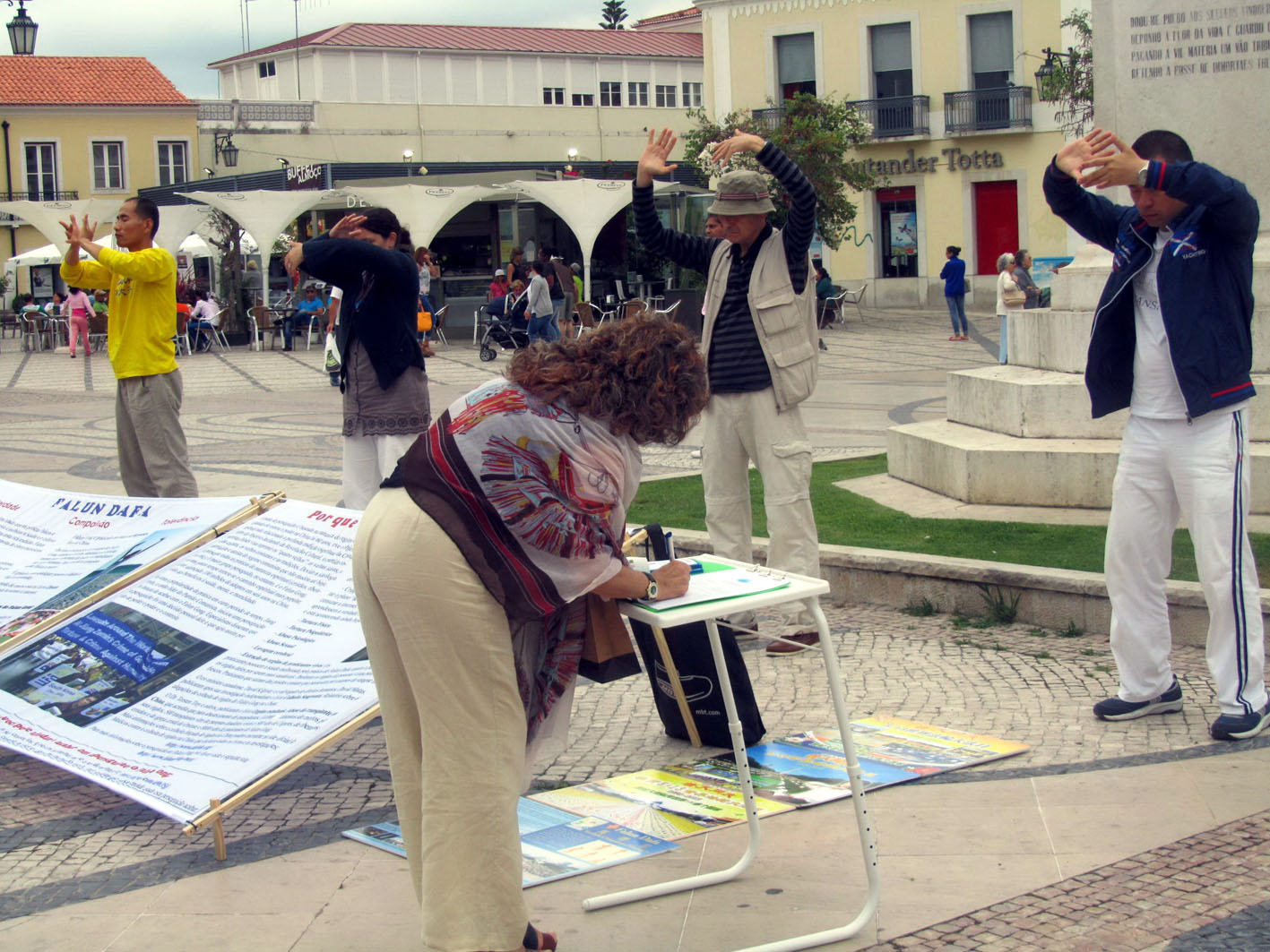 Coimbra市的不少民众告诉学员,法轮功的功法祥和优美,“我们这里太需要了!在哪里可以学炼?”有人听闻中共迫害法轮功真相后惊呼:“这难道是真的吗?我们实在不敢相信!中共太邪恶了!”有人说:“我们能为你们做点什么吗?“有的马上在征签簿上签名支持反迫害,立即停止活摘器官。还有的人说:“哇!这么残酷的真相,什么时候才能结束迫害?”