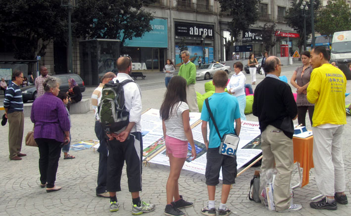 在Porto市,功法演示刚一开始,优美祥和的炼功音乐就吸引了很多人驻足观看功法演示。有位戴眼镜的先生说,我一看就喜欢这个功法,要不是赶时间去办事,就留下来学炼了。我们这个城市太需要这个法轮功啦!今天没时间炼太可惜了。还有位年轻人当即就想学炼功法,他把在哪里能够学炼功法咨询得清清楚楚才放心地走了。下班时,学员们在市政府大楼外面派发真相资料给从大楼里面出来的所有的工作人员,上至市长,下至清洁工,绝大多数的人都认真看了真相传单。