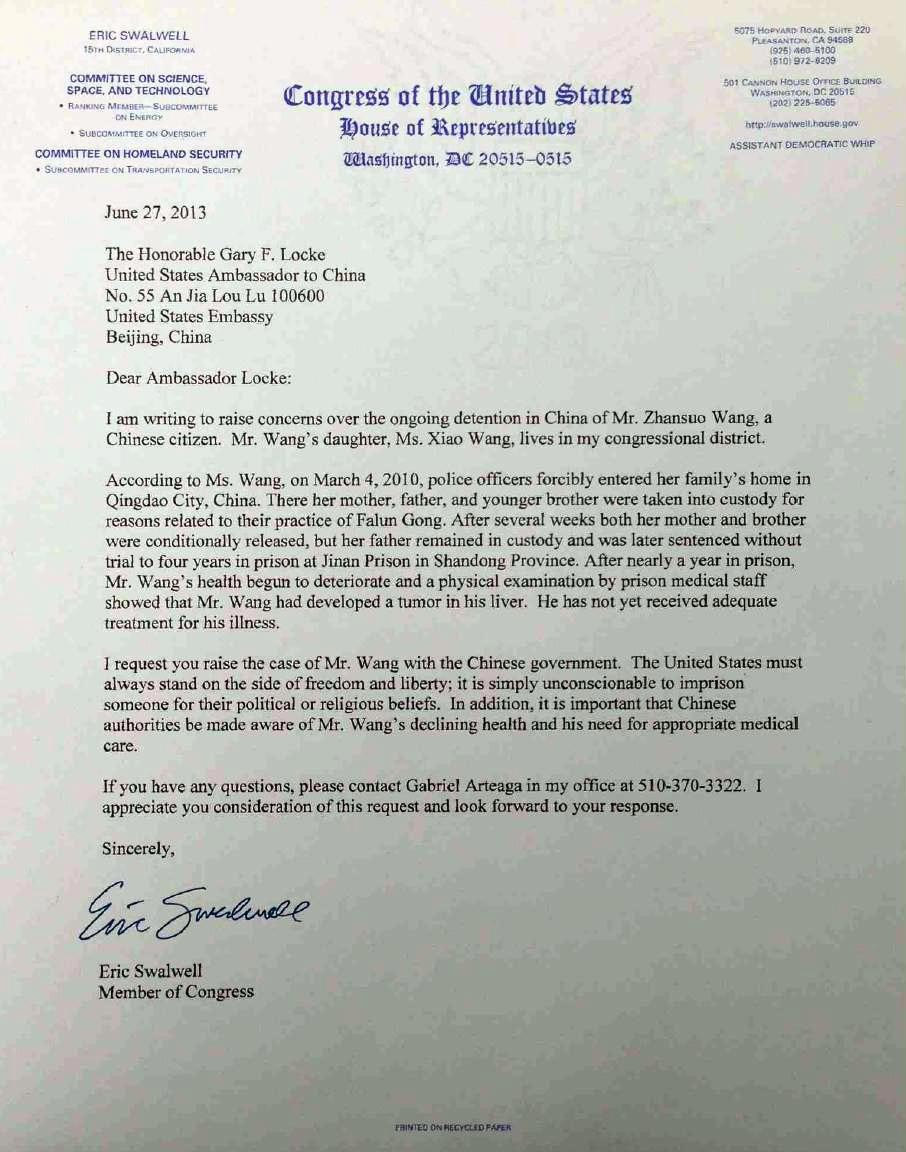 ![]() 美国国会众议员艾瑞克·史瓦维尔致美国驻华大使骆家辉的信 |