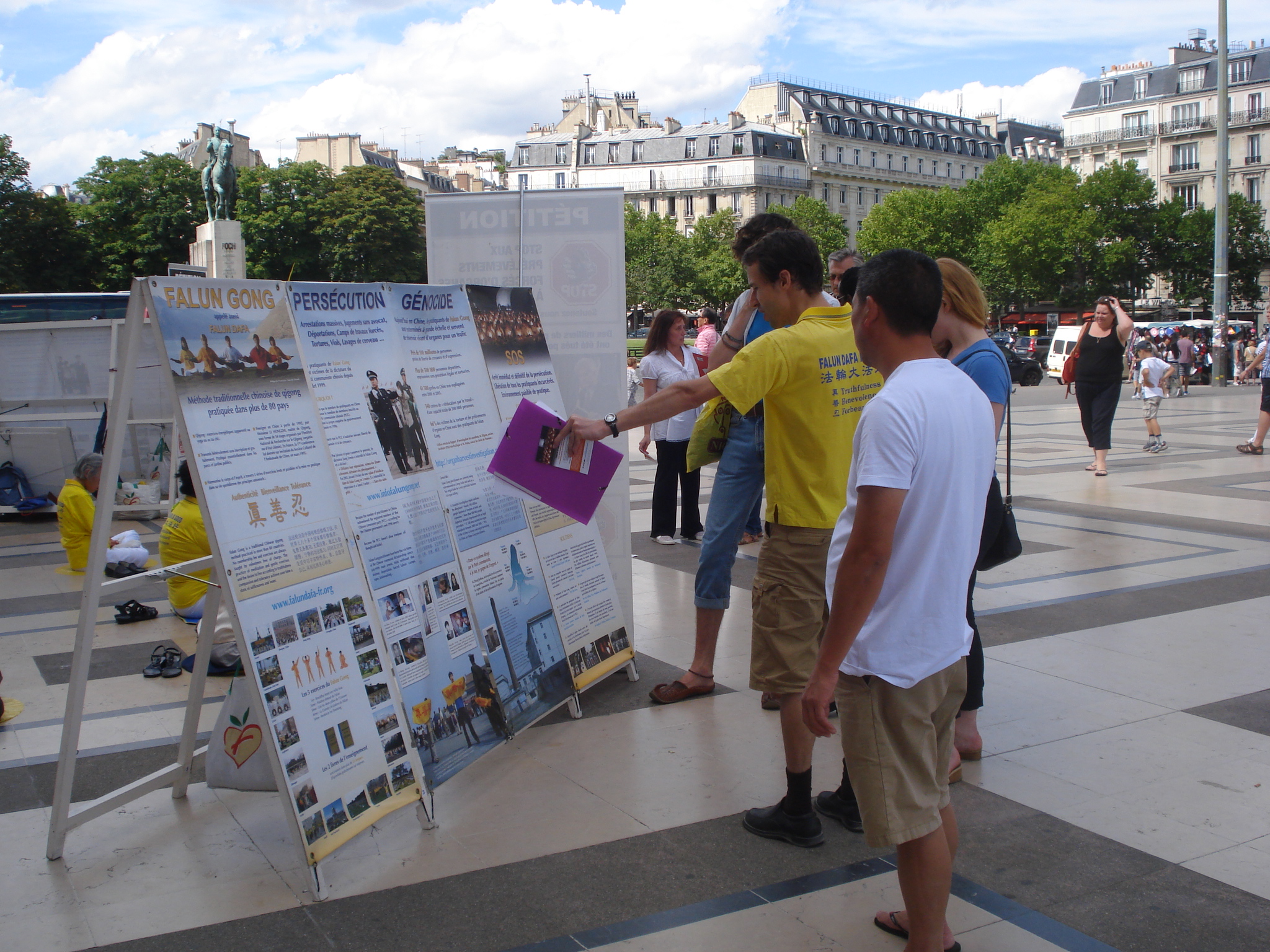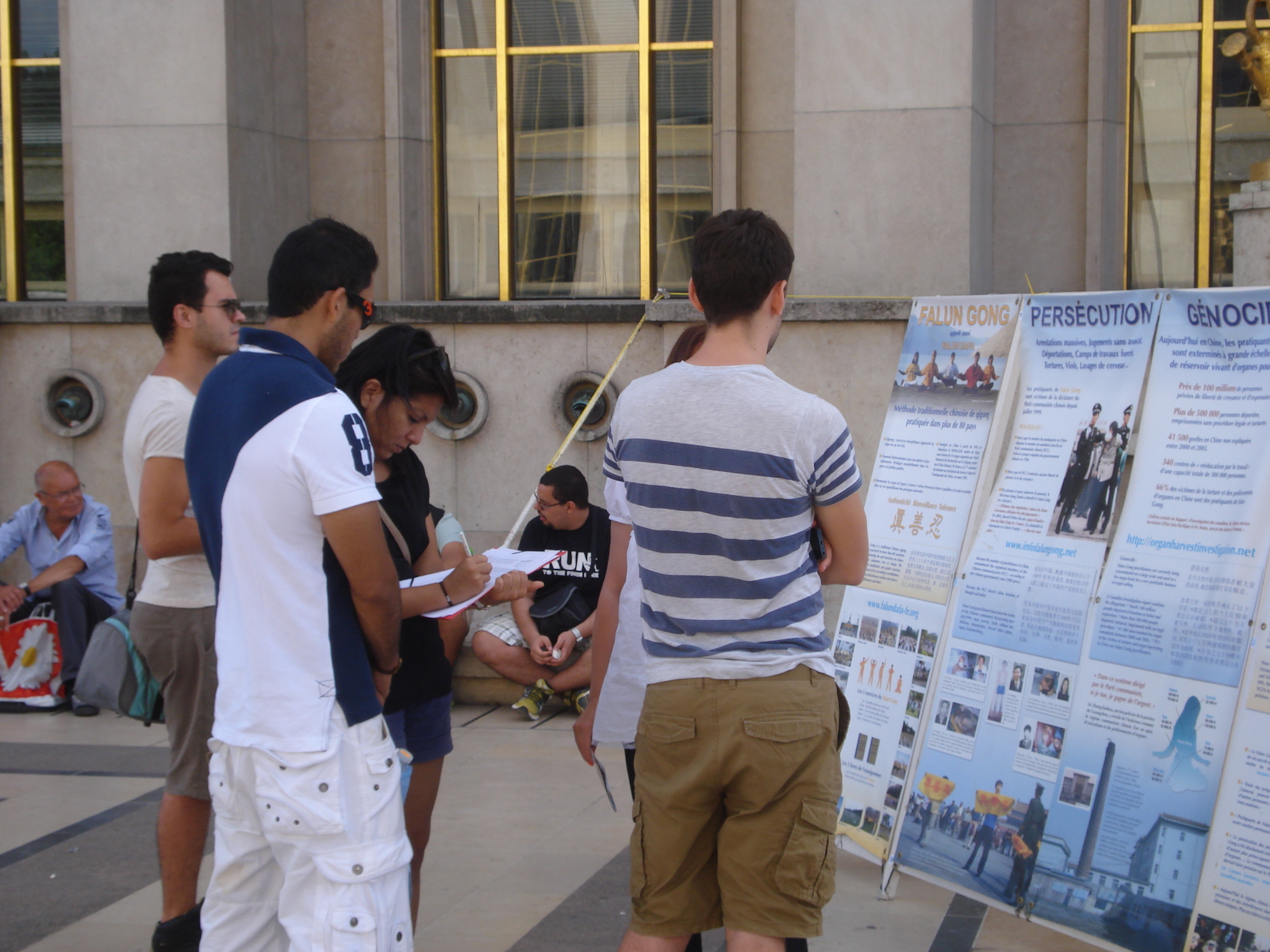 埃菲尔铁塔是各国游客的必经之地。法轮功学员提供了多种语言的真相传单,真相展板有英、法、中三种文字。来自世界各地的游人和巴黎市民,都被法轮功学员祥和的炼功场景吸引。人们观看展板,纷纷索取真相资料,了解真相后的人们都在征签表上签名,支持法轮功的反迫害行动。