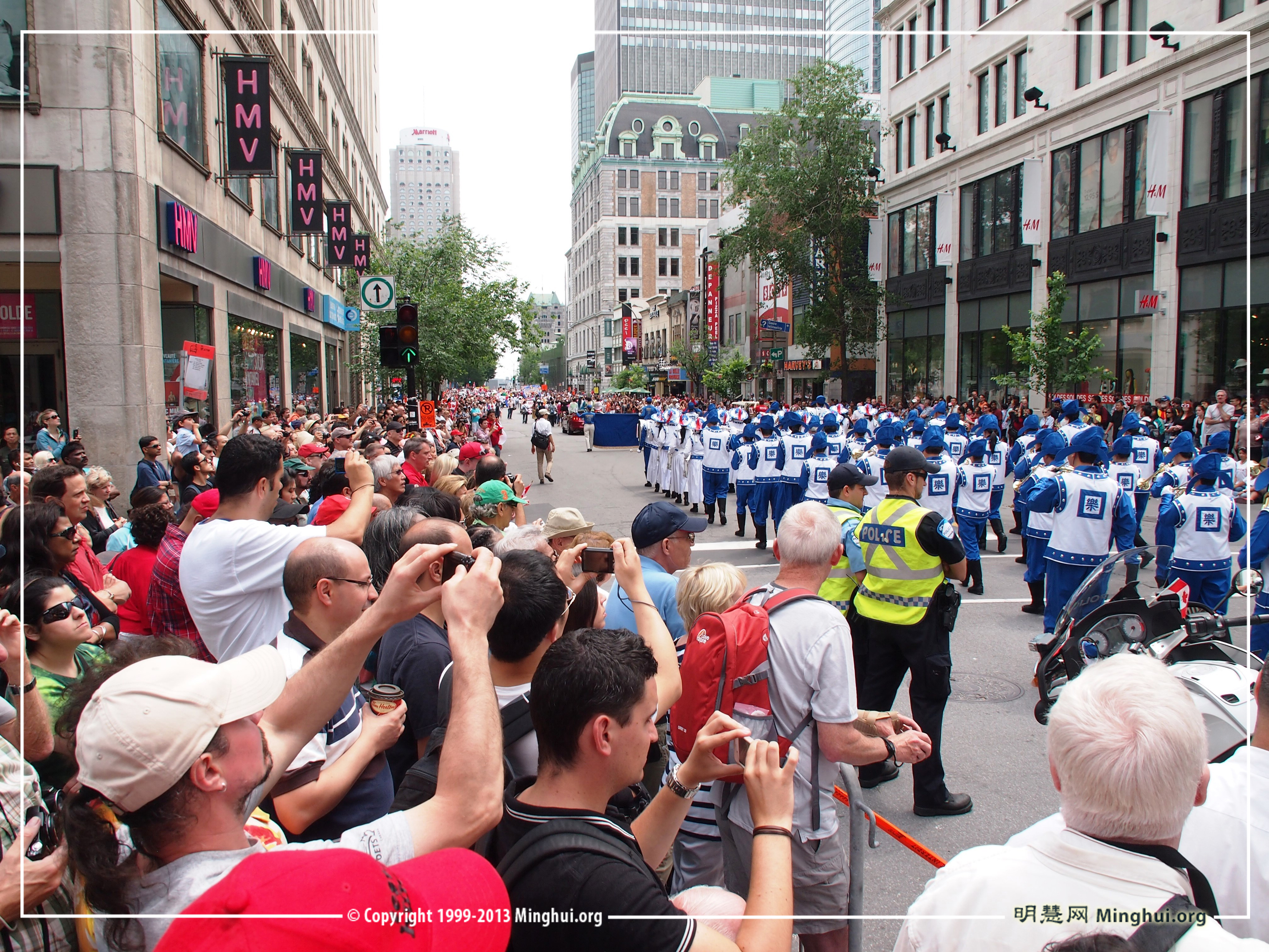 游行队伍由皇家骑警开道,从Guy街开始,沿繁华的Ste-Catherine大街一路东行至Peel街,天国乐团沿途一遍遍演奏《法轮大法好》、《法鼓法号震十方》、《法正乾坤》、《送宝》、《法轮圣王》和《永远的枫叶》等曲目。许多人随着演奏音乐的节奏舞动、欢呼。当天国乐团经过时,沿途热情的观众涌进街面近距离观看、拍照。
