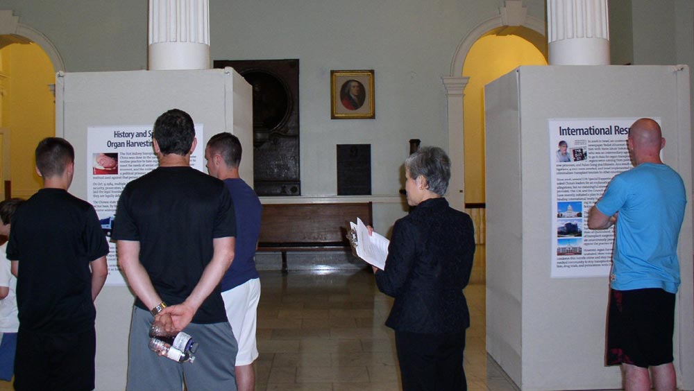 ![]() 参观者认真阅读“制止中共活摘器官”展板。 |
