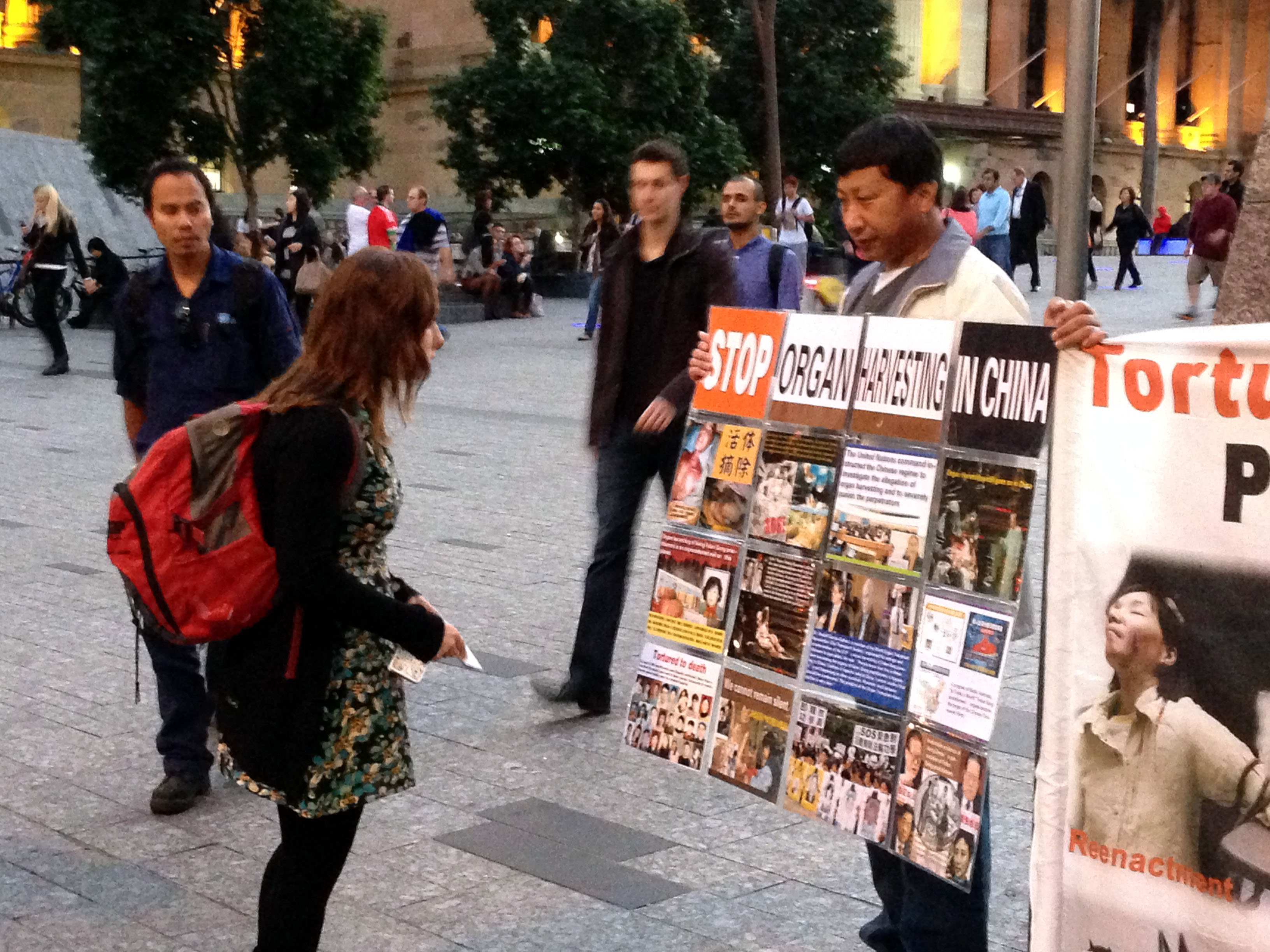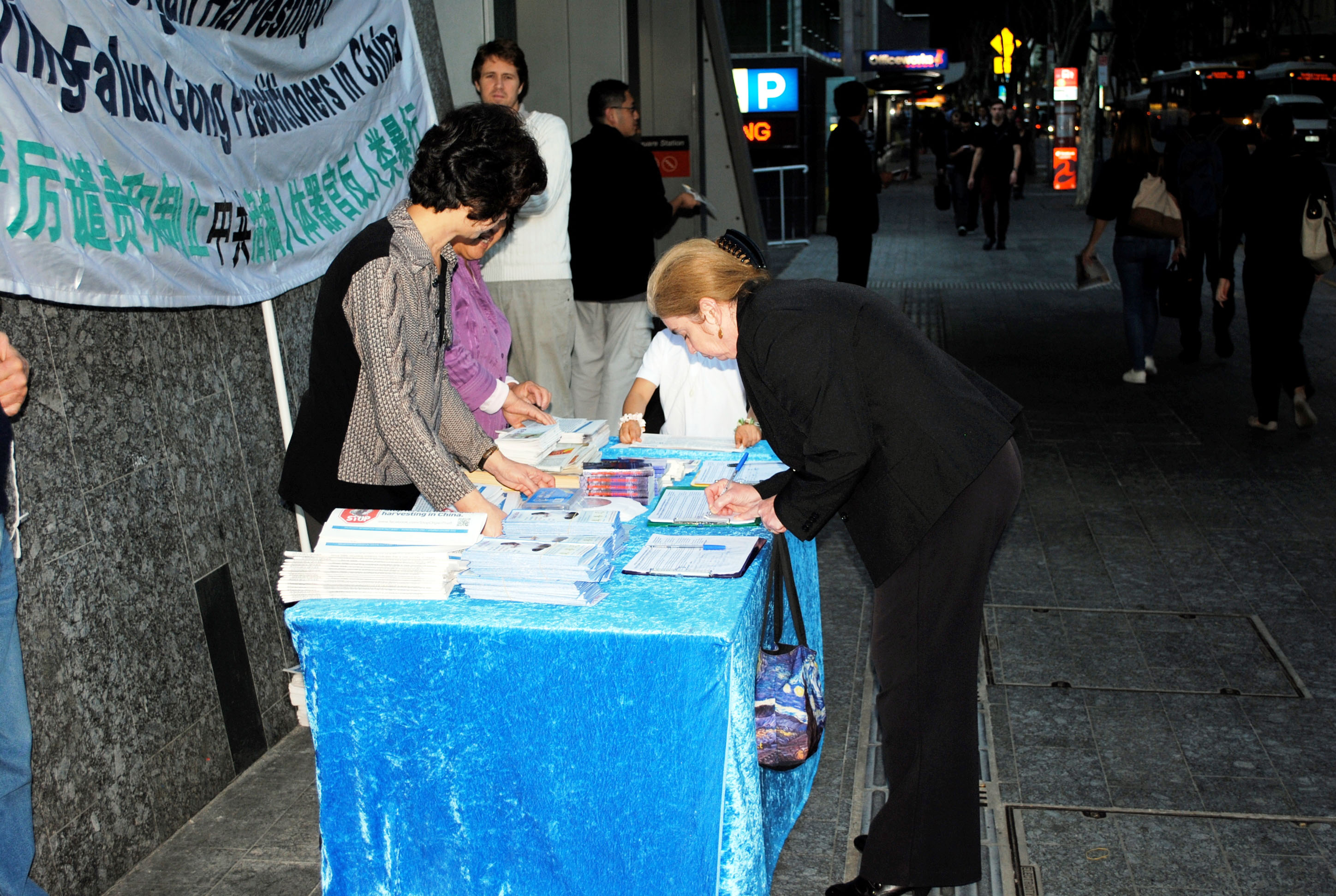 正值下班的巅峰时间,办公大楼蜂拥而出的人群被揭示法轮功学员遭受中共酷刑折磨的图片给震惊了。从欧洲移民来澳洲四十多年的洁达(Jada)女士皱着眉头说:“太可怕了!这场迫害太不可理喻了!”许多善良的澳洲人二话不说地主动在征签板上签名,抵制中共的暴行。几位华人也在得知中共虐杀法轮功学员的事实后,当场决定声明退出中共一切组织。