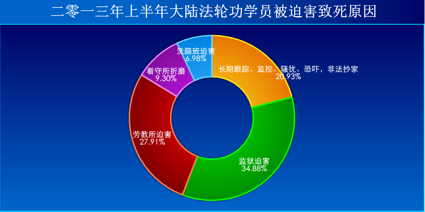 在2013年1至6月被迫害致死的43名大陆法轮功学员中,由于被长期跟踪、监控、骚扰、恐吓、非法抄家等迫害而去世的9人,被邪*党-监狱迫害致死的有15人,被劳教所迫害致死的有12人,被看守所折磨致死的有4人,被邪恶洗脑班迫害致死的有3人。如下面图和表所示。