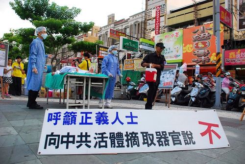 二零一三年八月十一日晚上,在嘉义市文化公园,法轮功学员们演出揭露中共活摘器官的行动剧,播放真相影片,现场并展出图片,让市民了解中共恶行。现场得到超过一千名市民联署签名,同声谴责中共惨绝人寰的罪行。