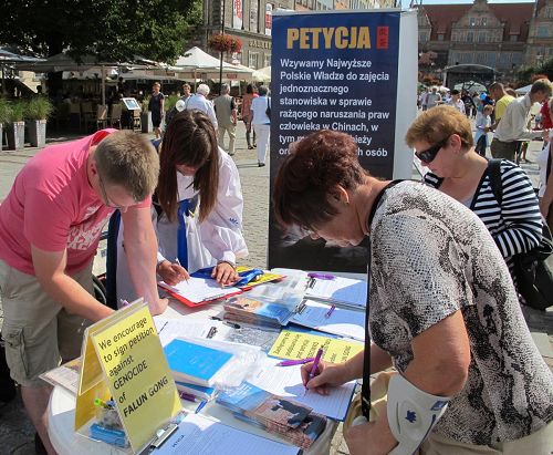 来波兰旅游的两位德国女士看见法轮功学员后,拿出钱要资助法轮功学员的活动,其中一人用英语说:我看不懂这个展板上的文字(指波兰语),但是(你们体恤衫上的)“法轮大法”字样我看懂了,在德国我们就知道法轮功真相。”法轮功学员非常感谢她们的好意(但婉言谢绝了金钱),同时拿出英文版征签表格告诉她们:“这是由‘反强摘器官医生协会’(Doctors Against Forced Organ Harvesting,简称DAFOH)发起的全球联署行动,呼吁制止中共活摘器官,如果你们能在这上面签名,我们会非常感谢你们的正义支持。”这位德国女士看了征签表格上的详细说明后表示:“我就是医生啊,为此而签名是我义不容辞的责任。”另一位女士说:“我不是医生,但签名也是必须的,应该的,毫无疑问的。”二人都在征签表格上签上名,在走前还不断地对学员说:“祝你们成功,你们一定能成功。”