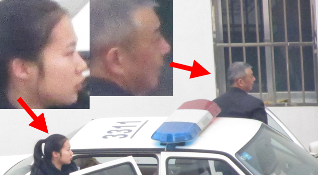 图2:到潍坊市洗脑班迫害法轮功的两个恶警(一男一女、一老一年轻)。这两个恶警从警车上下来,后面是洗脑班牢房的窗户。然后这两个恶警和洗脑班的恶人有说有笑的进入迫害法轮功学员的牢房。