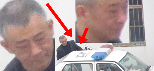 图4:到潍坊市洗脑班迫害法轮功的恶警(这张图上是同一个人)。这个恶警从警车上下来,后面是洗脑班牢房的窗户。然后这个恶警和洗脑班的恶人有说有笑的进入迫害法轮功学员的牢房。