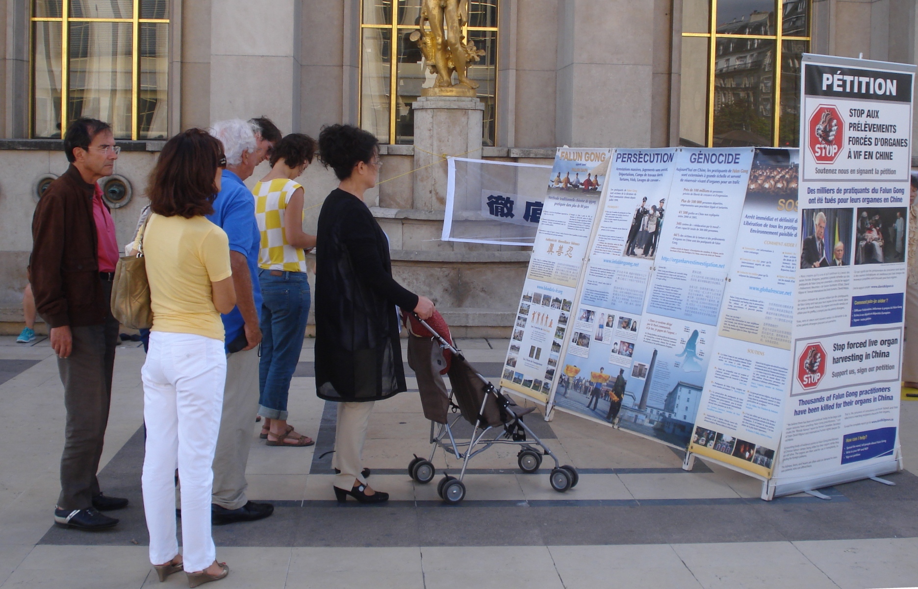![]() 巴黎人权广场上,民众阅读展板,了解法轮功真相。 |