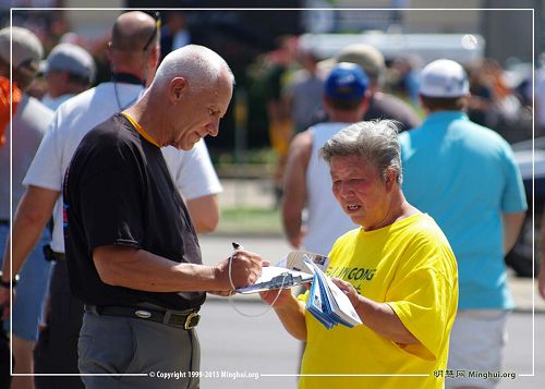 一位年轻人走向一位学员,要求签名。他说,他是从多伦多来的。他看到法轮功学员多年来一直在中国驻多伦多领事馆前举行抗议活动,他对学员们的不懈的努力表示由衷钦佩并表示支持。