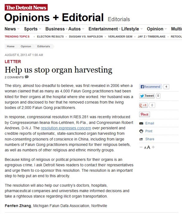 八月六日,美国密西根州第二大报纸《底特律新闻》“观点+编辑”板块,全文刊登了密西根学员张女士的一封来信,题为“帮助我们制止活摘器官”。信中说:“这个真相,几乎是可怕的让人难以置信,然而在二零零六年,第一次被一名女士揭露开,她的丈夫是一名外科医生,直接参与了摘除两千多名活体法轮功修炼者的眼角膜。据她所知,她所在的医院里有超过四千余名法轮功修炼者被活体摘取器官,然后死亡。”