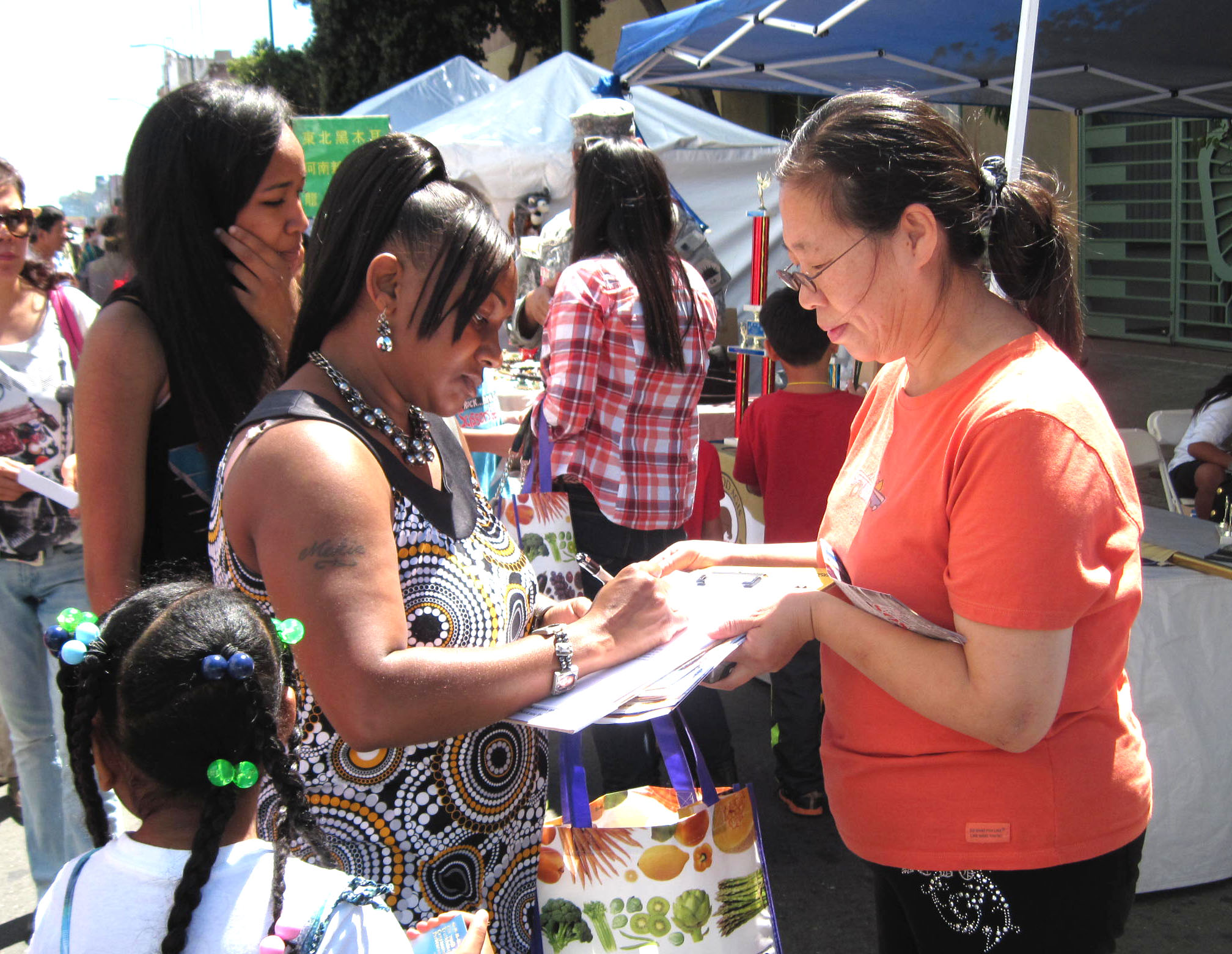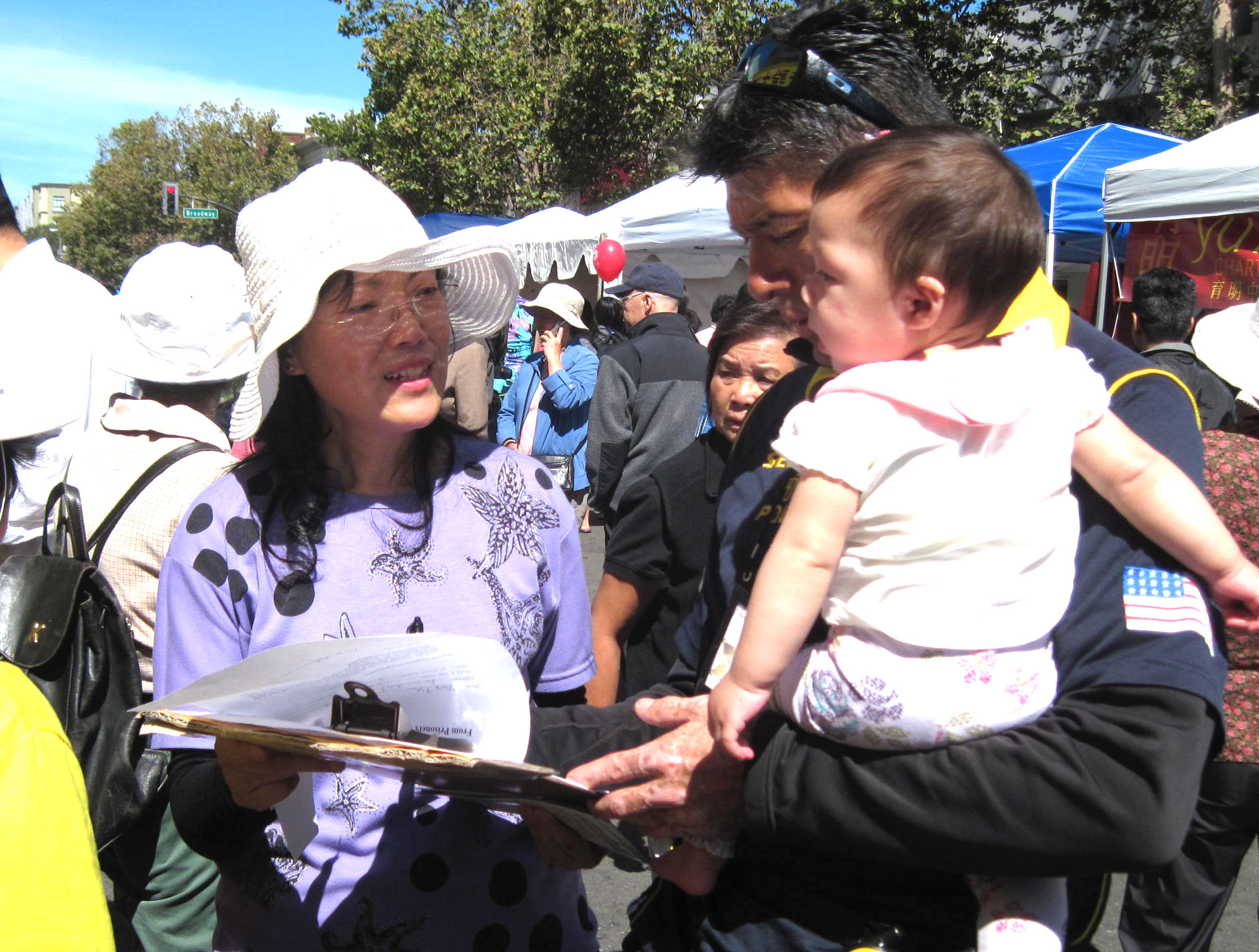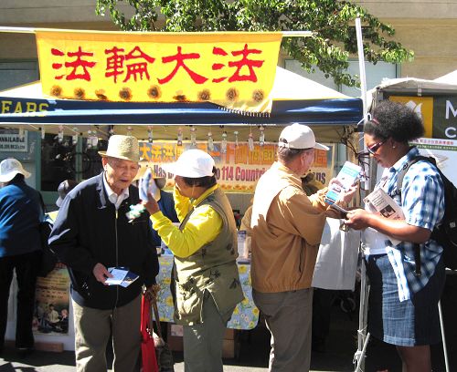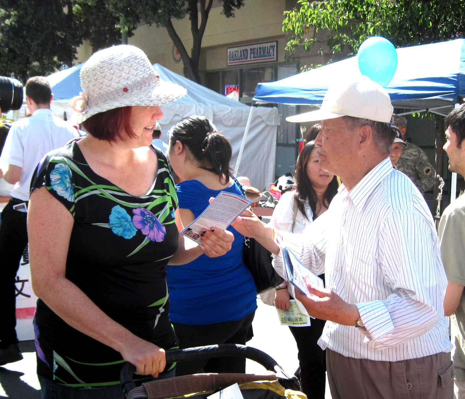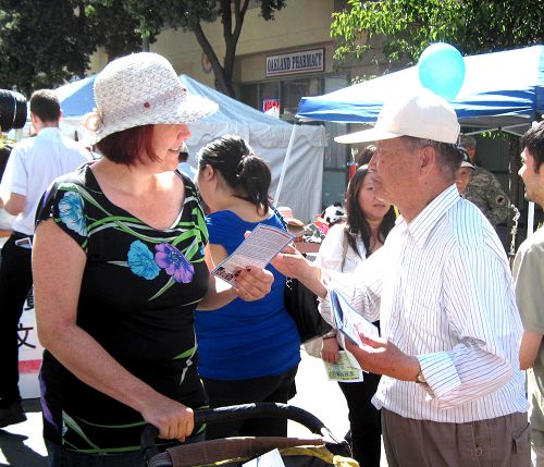 奥克兰中国城街会每年都会吸引几万游客参加。两天来,有超过二百个商家设立摊位参加展销,游人众多、络绎不绝。法轮功学员利用这个机会,向游客讲真相。