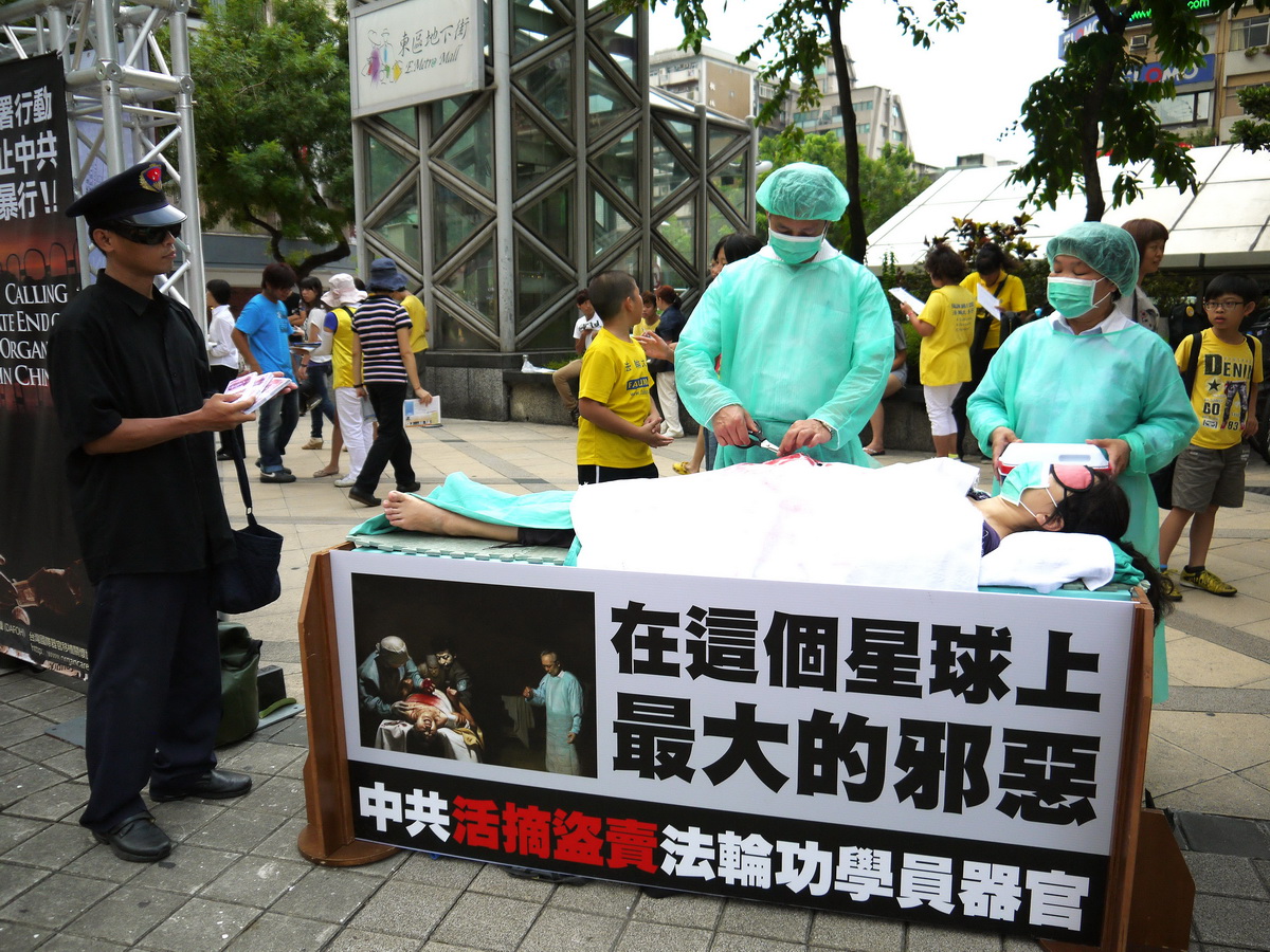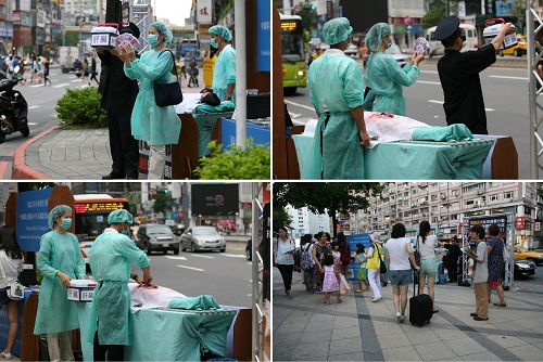 ![]() 图1:八月二十四日台北大安森林公园路口举办以真人演示活摘器官的行动剧,揭露中共的暴行。 |