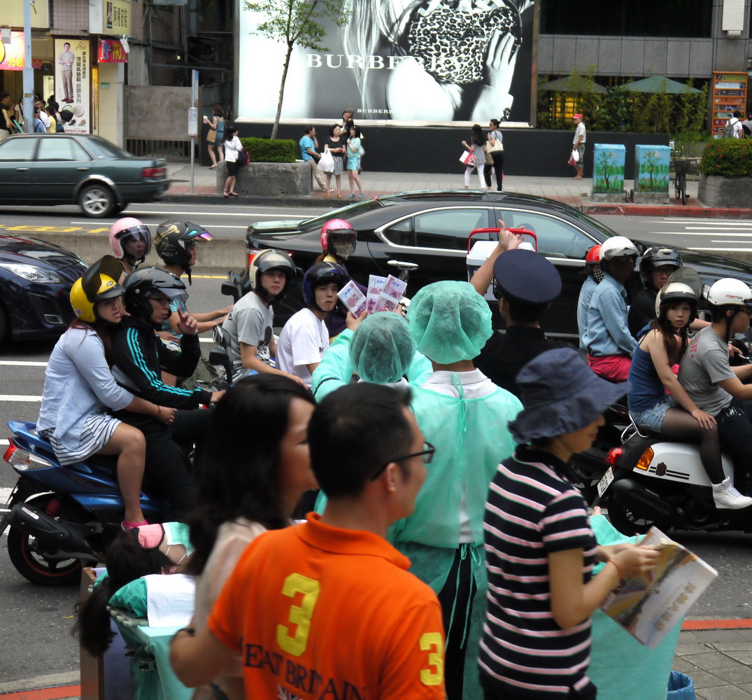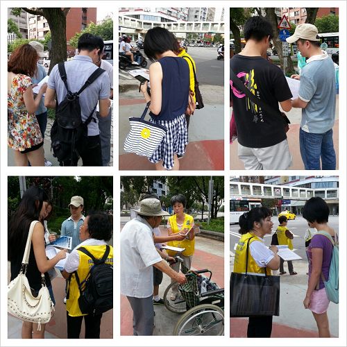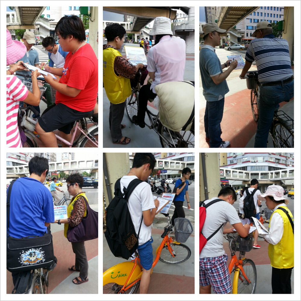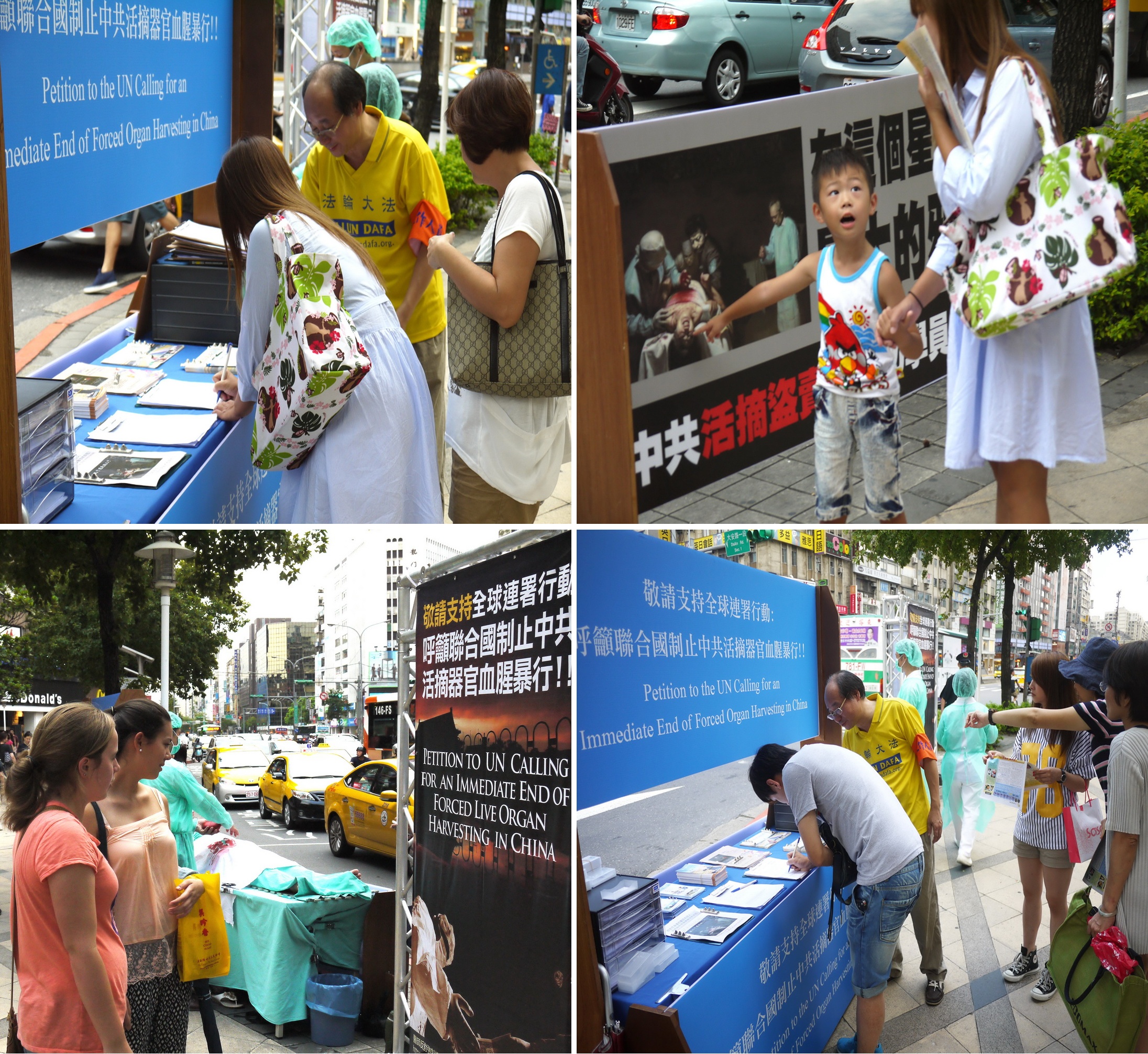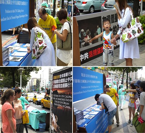 二十四日,法轮功学员在大安森林公园入口处,举办以真人演示中共活摘器官的行动剧,由于地点恰好在马路口,许多公车上的民众露出震惊的表情,纷纷拿起相机不断拍摄,更有许多等红灯的机车骑士在学员说明下签名,连计程车司机也摇下车窗收下学员递上的真相资料并签下名字。而来来往往围着公园骑单车、慢跑运动的民众,尽管行路匆匆、大汗淋漓,也在明白真相后,停下脚步提笔联署,纷纷表达对良心正义的支持。
