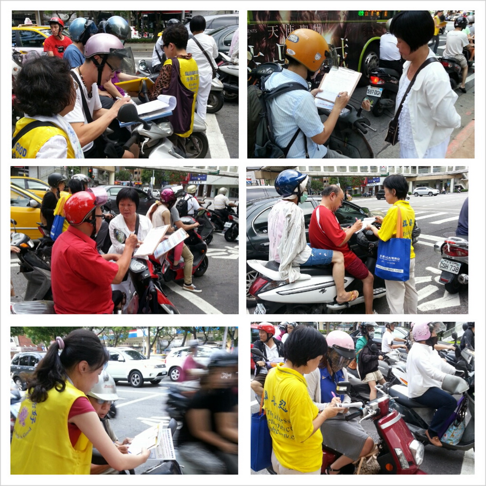 学员们也利用马路红绿灯停下来的一分钟空档,争分夺秒地向机车骑士讲述活摘器官的真相。一对骑机车的夫妻签名后表示,中共没有什么事情是不敢做的,我们相信活摘器官的事情是真的。一位骑着摩托车的家庭主妇,原本着急表示自己没有时间,不过当同修和她讲述征签的意义后,她马上签下自己的名字,并对同修说:“你们辛苦了!我佩服你们,你们要继续下去!加油!”一位骑士则提醒学员说:“只剩十五秒了,我来签!”另一位骑机车的女士则在签完名后用手势向学员敬礼,表达佩服。