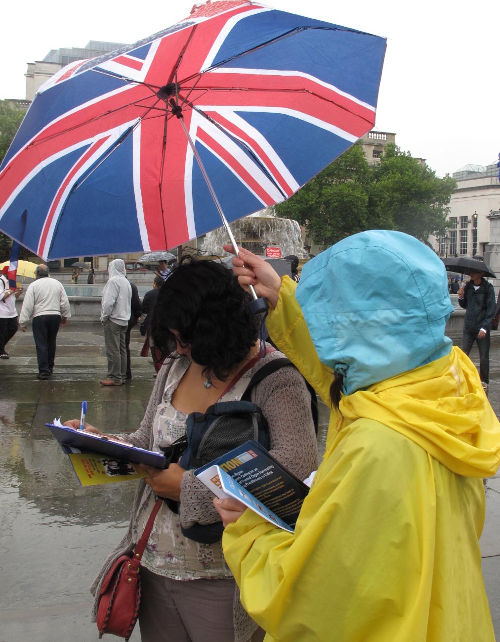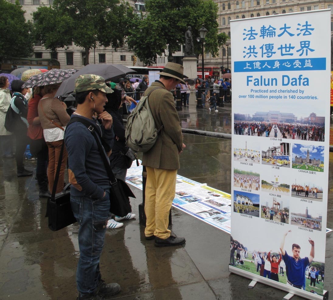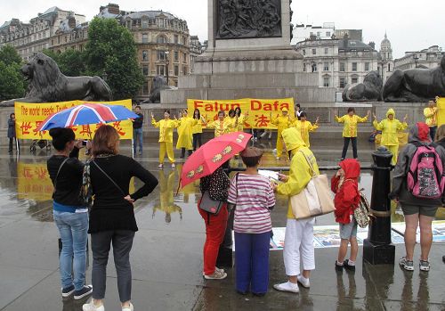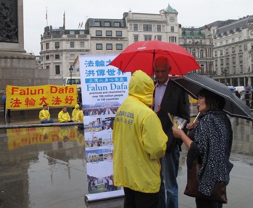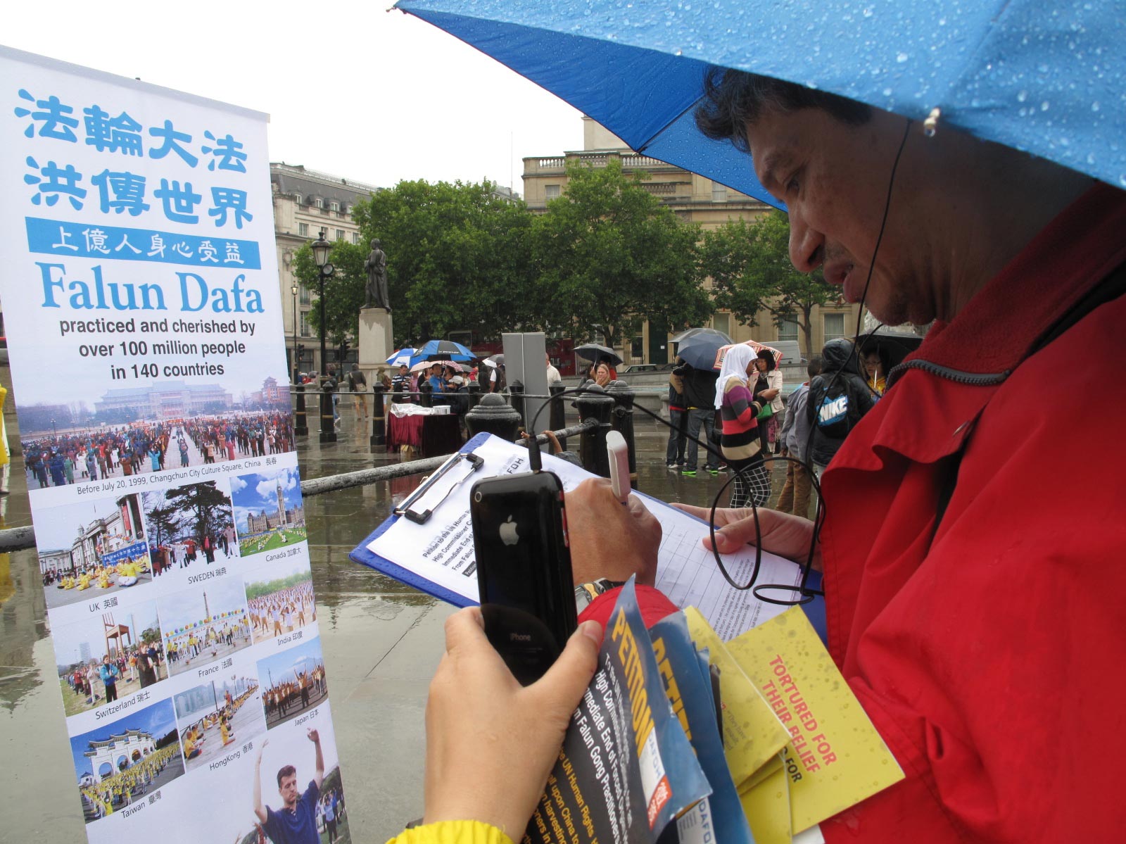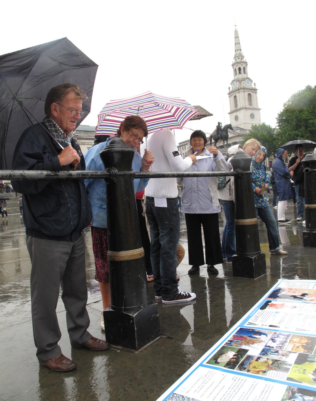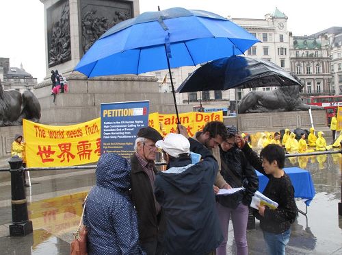 法轮功真相的呈现,特别是中共活摘法轮功学员器官罪恶的曝光,让鸽子广场上、来自世界各地的游客们深受震撼。尽管当天活动碰上了伦敦的下雨天气,有时雨下的很大,但参加活动的法轮功学员不为所动,把鸽子广场变成以风雨做幕、传播法轮功真相、揭露中共邪*党-罪行的舞台。面对法轮功真相,人们在思考、在选择,了解真相的人们纷纷在“医生反对中共强摘器官协会”(DAFOH)发起的制止中共强摘器官、呼吁停止迫害法轮功的征签表上签名,支持法轮功反迫害。