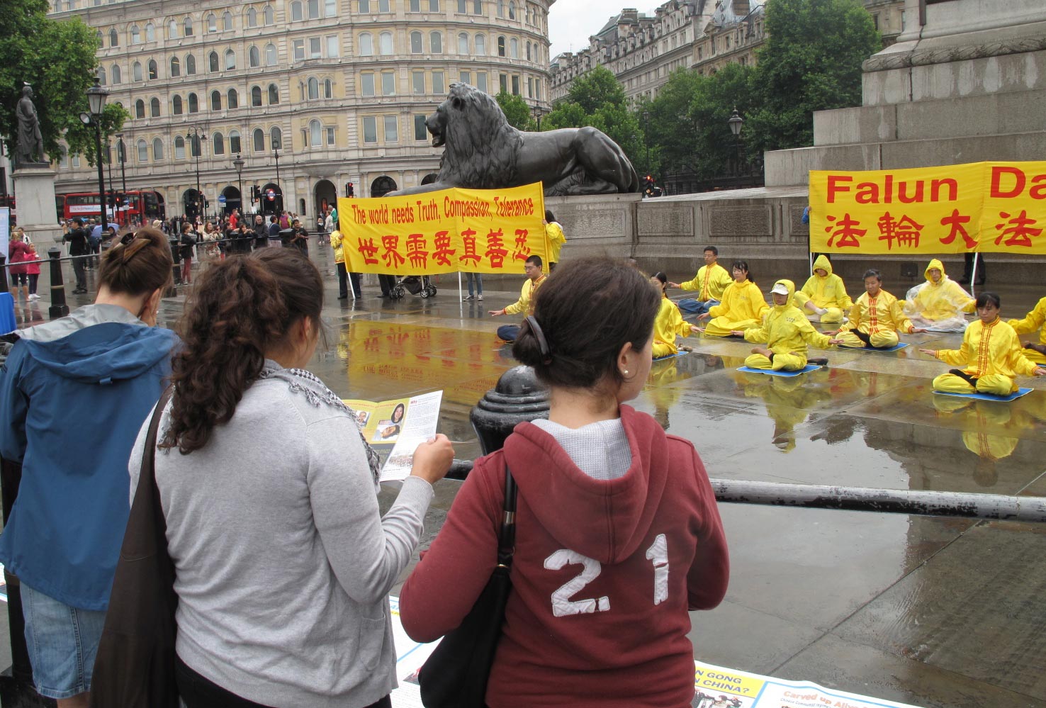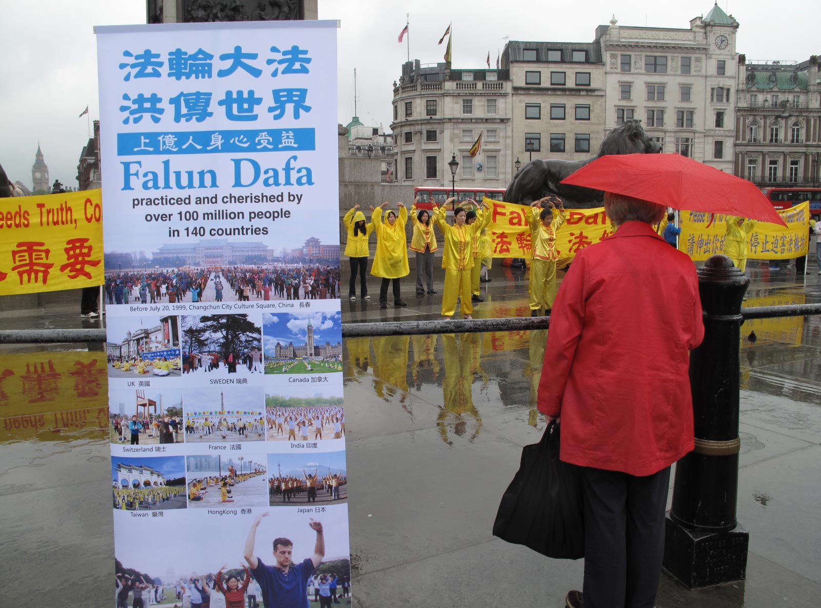 哈德森女士(Ms. Hudson)是位住在伦敦郊外的心理学家,当日下午她在路过鸽子广场时看到了正在雨中打坐的法轮功学员,她被法轮功学员们专注平和的神情所吸引,立即掏出自己的相机把法轮功学员雨中打坐入静的画面摄入镜头。和法轮功学员简短对话后,她立即在反对中共强摘器官征签表上签名。她表示自己非常清楚中共政权在侵犯人权上的劣迹,并指出从心理学的专业角度能够理解中共为什么害怕法轮功。她说:“平和的打坐非常有益,她能让你头脑清晰。但有人会因此害怕,怕因此失去对你的控制。”哈德森女士还由衷地表达对在雨中坚守不动平和打坐的法轮功学员的赞赏,她说:“哇,在这样的环境里能够这样专注,太了不起了,这样的打坐本身就太有吸引力了,何况你们是坐在这里,在鸽子广场。”