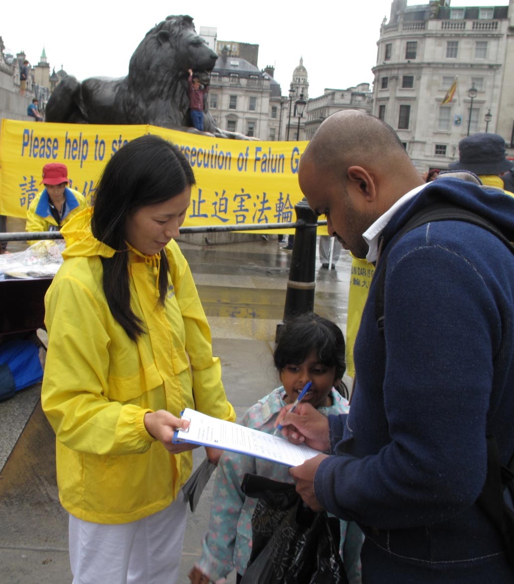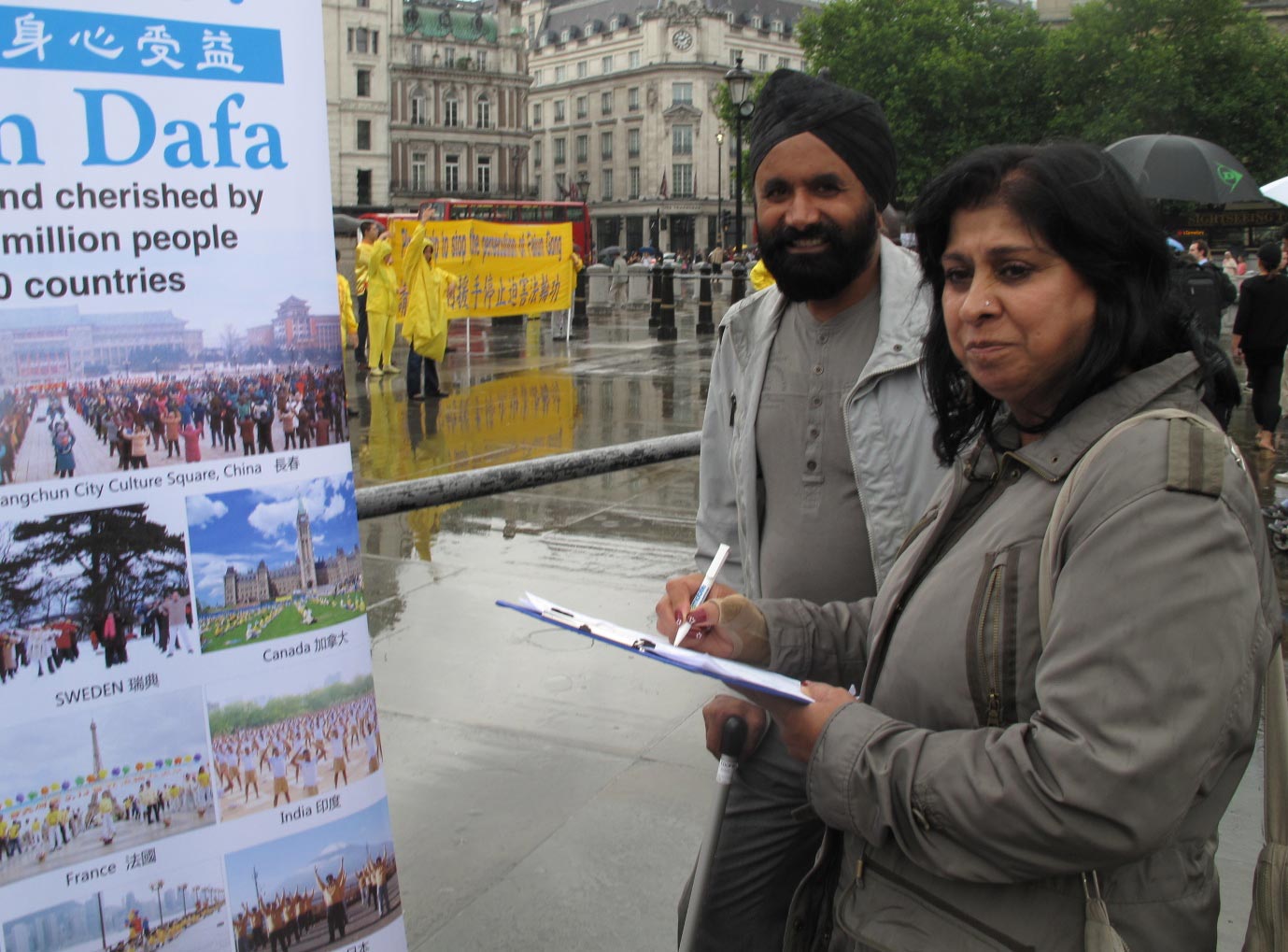 印度裔的库迪夫妇(Mr. and Mrs. Kundi)住在伯明翰附近一个小城,当天计划到伦敦转一转的他们不知为何就来到了鸽子广场,结果在这里第一次听到了法轮功真相,然后就毫不犹豫地在“反对中共强摘器官”征签表上签名,表示决不允许器官活摘这样的事情在人类发生。另外,他们还说自己非常喜爱中华传统文化,觉得法轮功学员穿的炼功服非常漂亮。