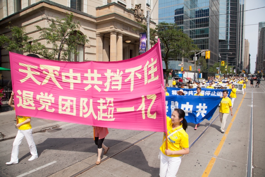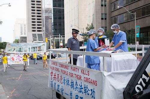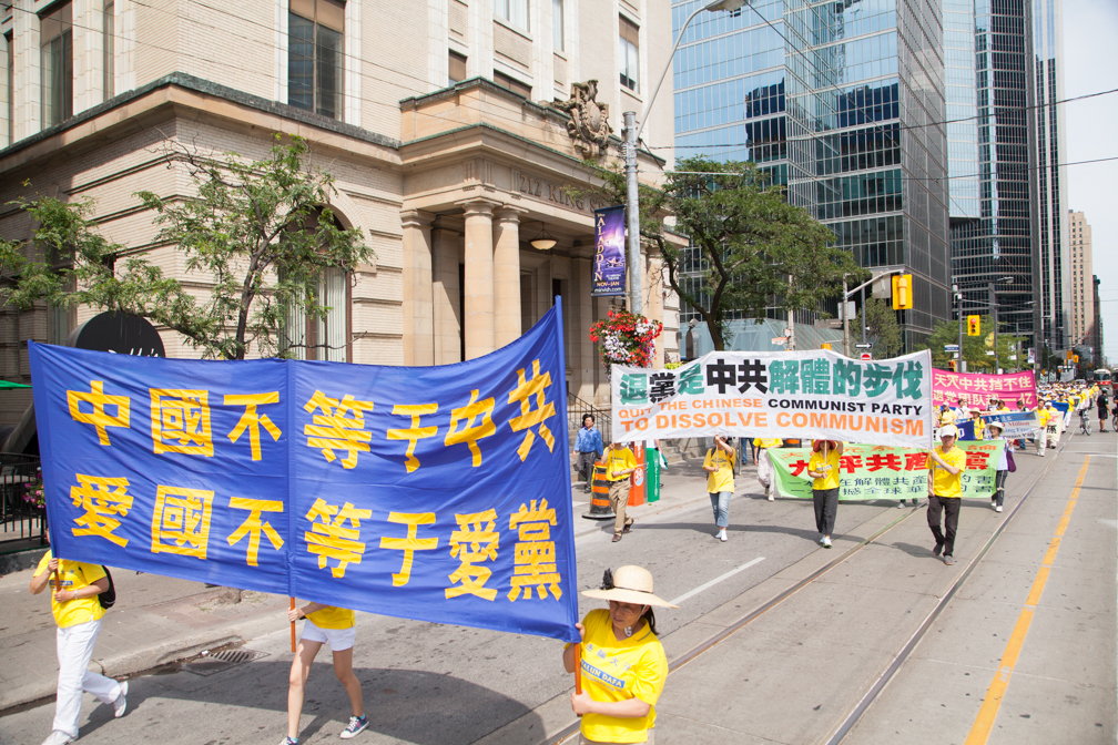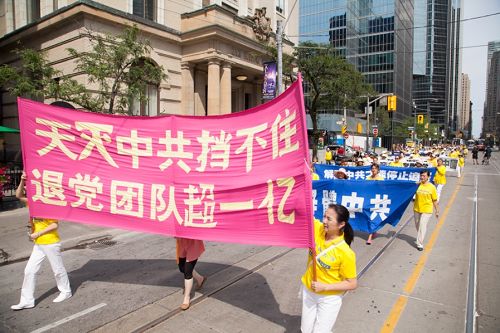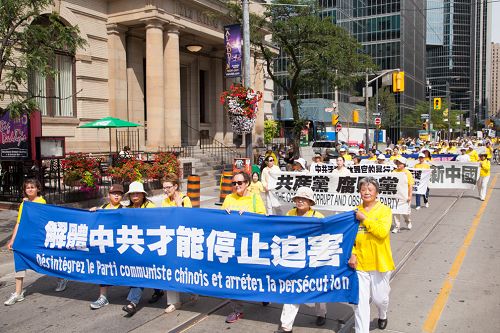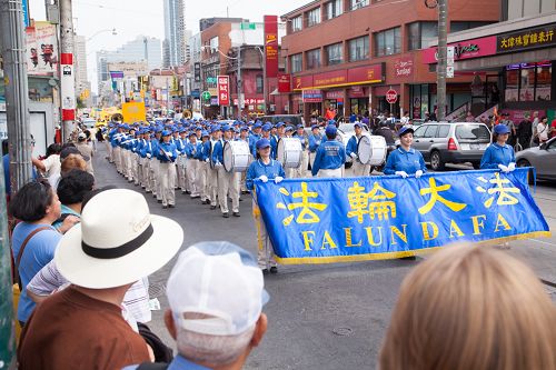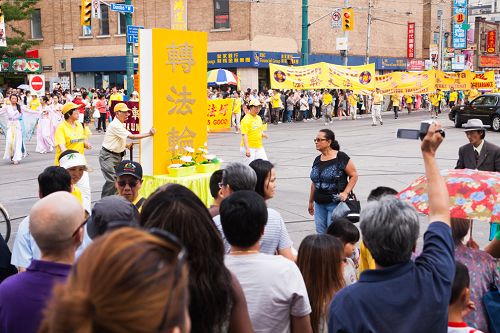 下午一时,浩浩荡荡的游行队伍从大都会出发,行经卑街、多伦多最繁华的商业中心登打士广场、唐人街,沿途吸引各族裔市民和游人驻足观看,不少民众拿出手机拍摄,有观众在了解法轮功学员遭受酷刑情况后在请愿信上签名制止迫害。