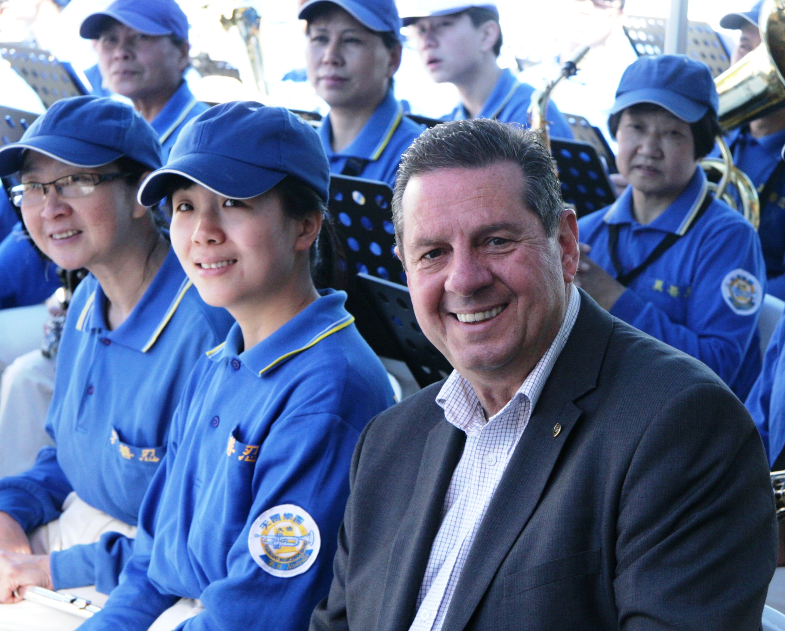 图2:Watson 区自由党候选人罗恩•德勒兹奥(Ron Delezio)来到天国乐团中与法轮功学员合影。