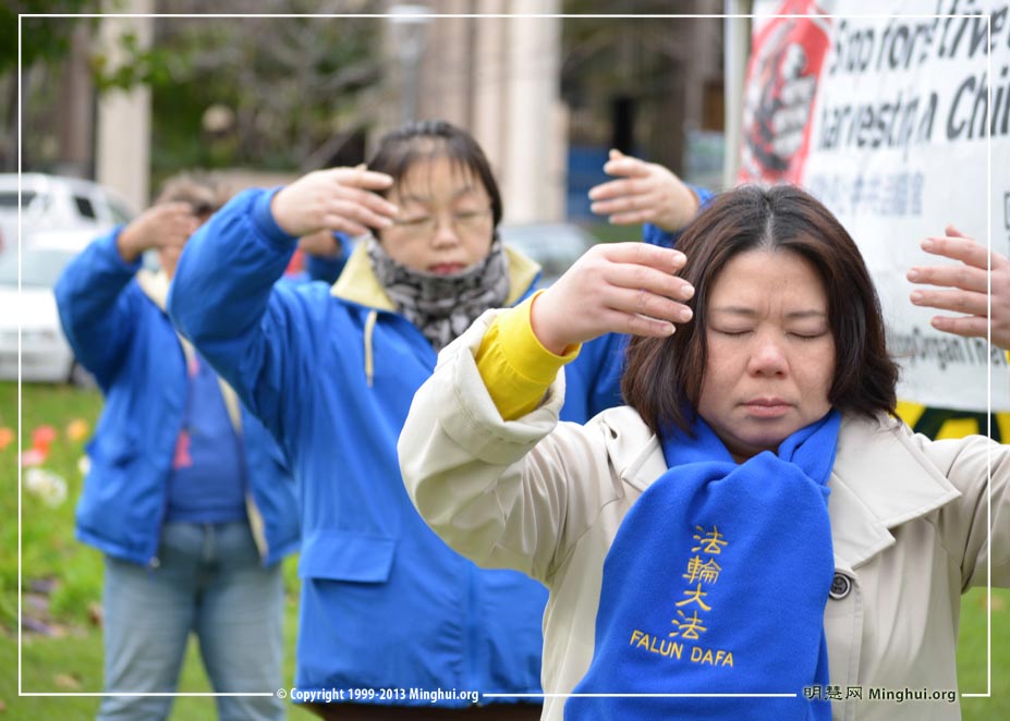 当日清晨,法轮功学员们身着黄色、蓝色炼功服,在舒缓的炼功音乐中集体炼功。优美祥和的功法动作吸引了过往的行人,因此驻足观望。有些民众停下来观读摆放的真相展板,并在听了法轮功学员讲的真相后,主动在征签簿上签上了自己的名字。