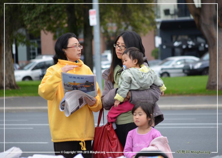 另有两位从中国大陆来到澳洲一年多的老人家,刚看到法轮功学员在举行活动时不理解,态度也不好,在法轮功学员善意耐心的劝善后,两位老人家的态度有了很大的转变,并且带走了很多法轮功学员赠送的真相资料。