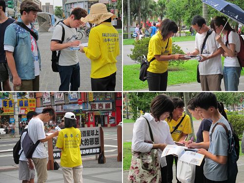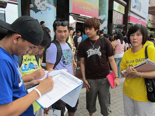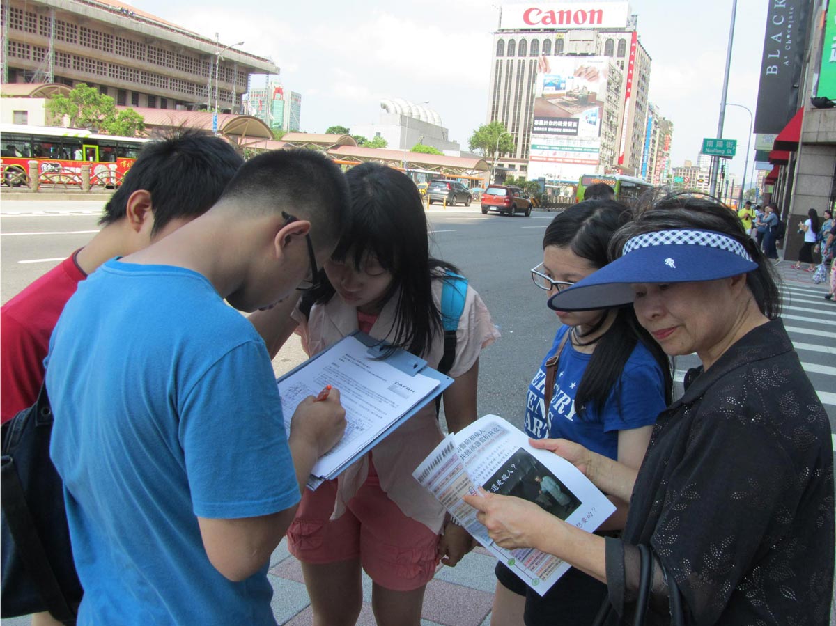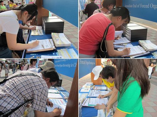 两天的讲真相征签活动中,除了台湾民众外,还有来自中国大陆、澳门、日本、韩国、新加坡、马来西亚、泰国、印度、菲律宾、印尼、越南、以色列等亚洲国家,以及美国、英国、意大利、巴拿马、多明尼加、瓜地马拉等欧美国家的游客,身份包含了医师、律师、教授、教师、护理师、护士、工程师、会计师、研究员、军人、警察、音乐家、导演以及学生和家庭主妇等。广大民众参与联署,汇入全球正义洪流中,共同谴责中共的残酷迫害,并且呼吁:立即制止中共血腥活摘法轮功学员器官牟利的邪恶罪行。