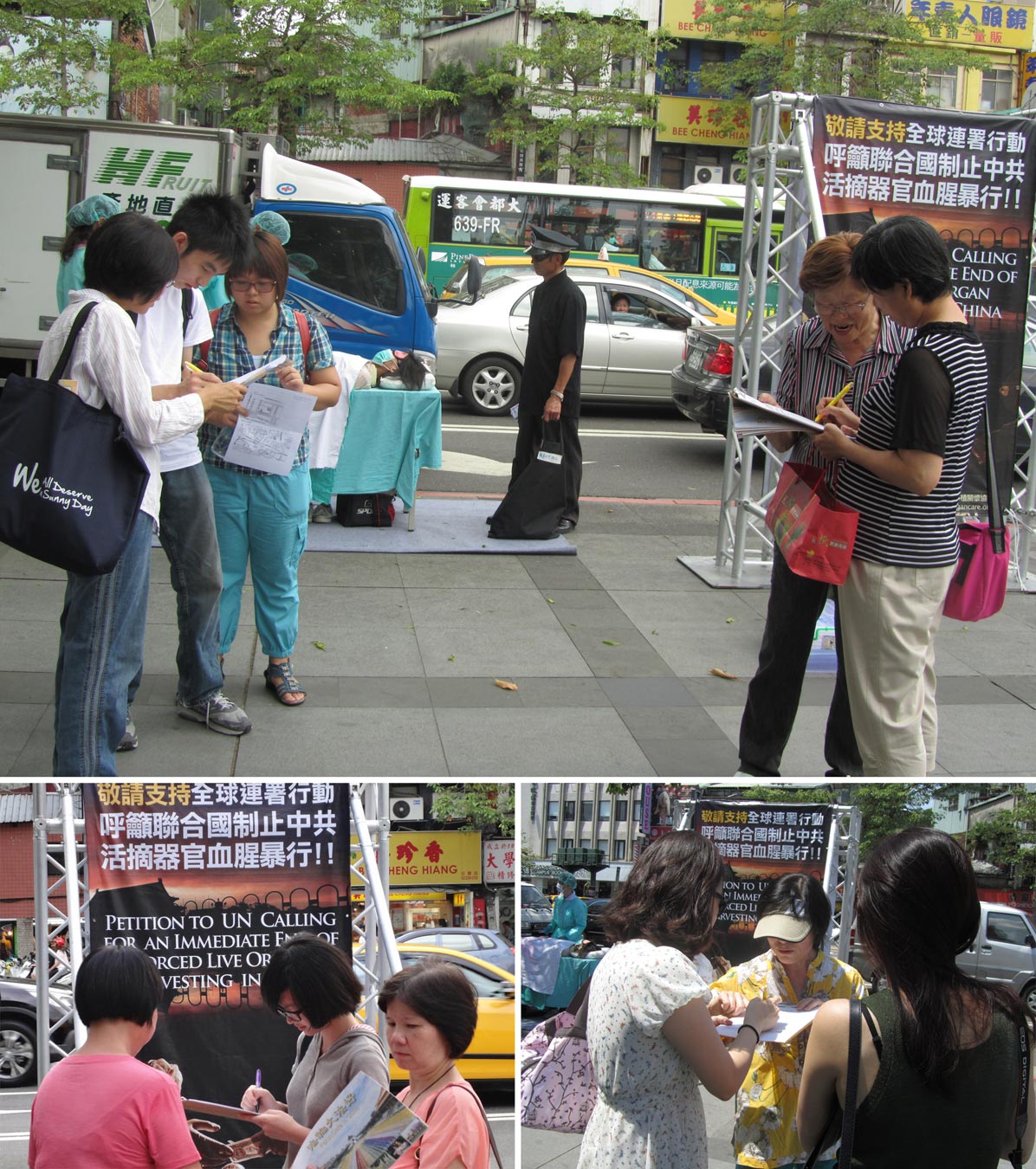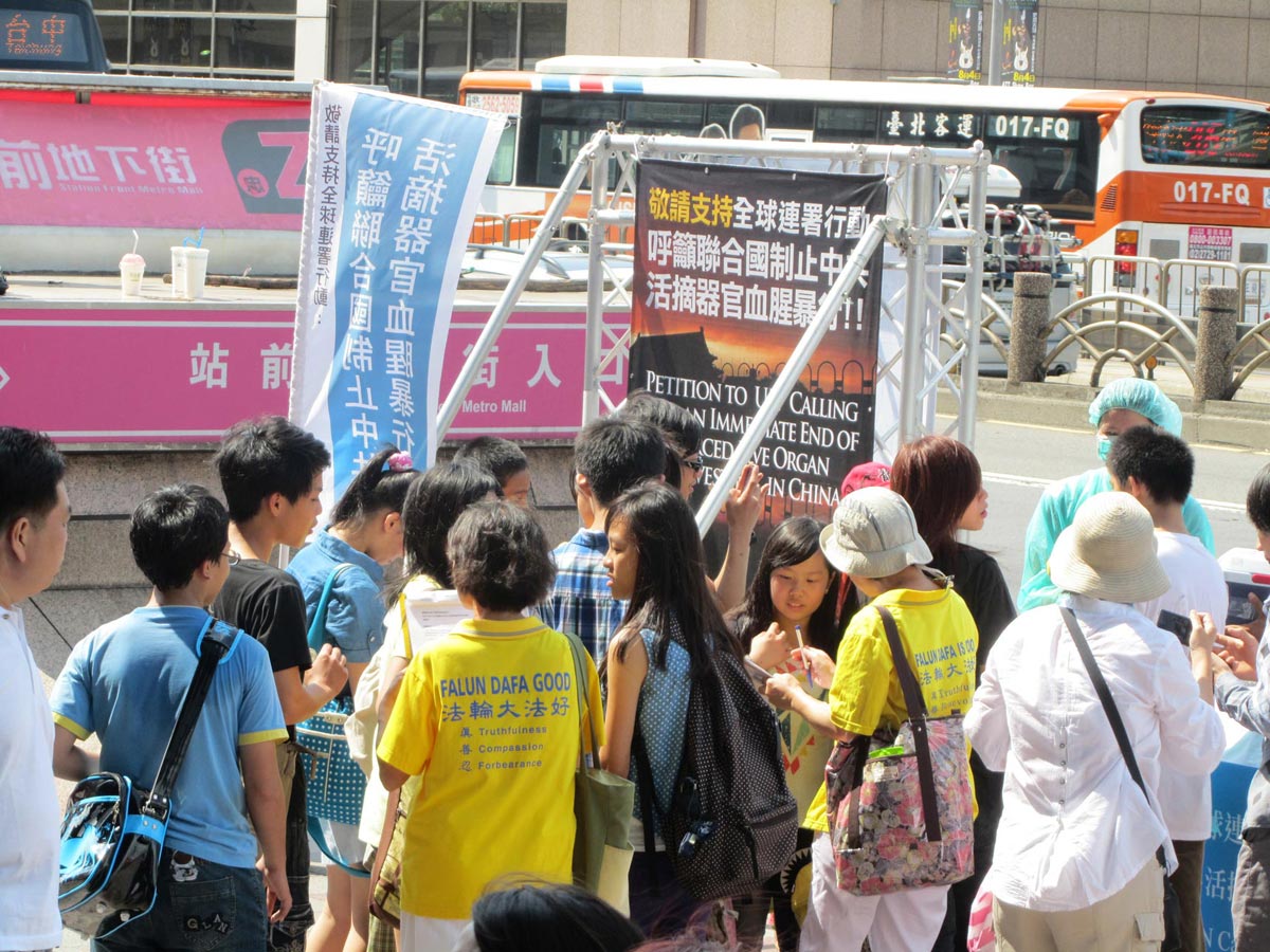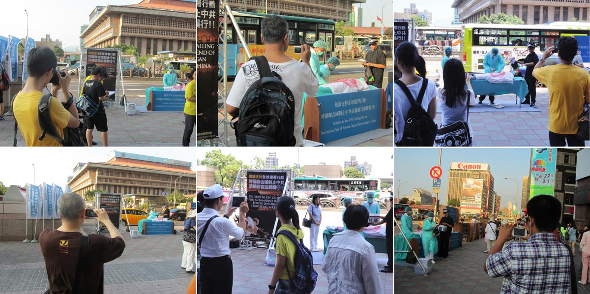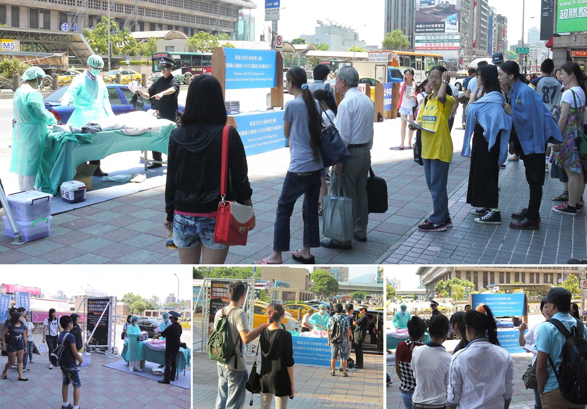 二零一三年八月三日、四日,台北法轮功学员在台北罗斯福路公馆路段及台北车站对面的热闹商圈,以模拟活摘器官的演示活动剧,揭露中共活摘盗卖法轮功学员器官的暴行,并且向过往民众征签,汇集正义的支持,制止迫害。