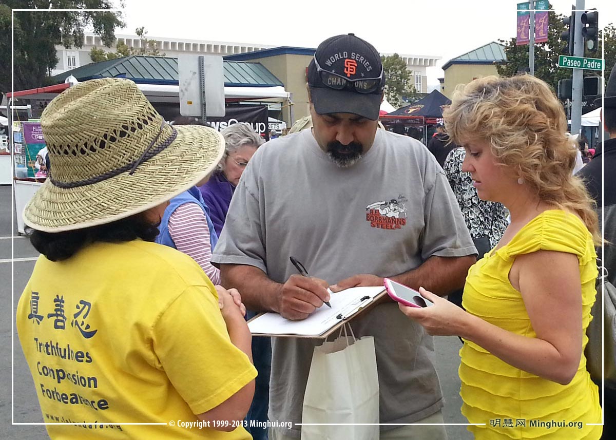 制止中共活摘的签名活动在几个星期前就在湾区各地展开。许多路人主动走到法轮功学员的摊位要求签字。他们表示,已经知道在中国发生的迫害。但活生生的摘走人体器官把人杀死,再贩卖器官赚钱,这种行径闻所未闻,希望迫害能够立即停止。有的人仔细阅读美国众议院281号决议案,表示要写信给他们当地的国会议员,要求议员在决议案上签名联署。