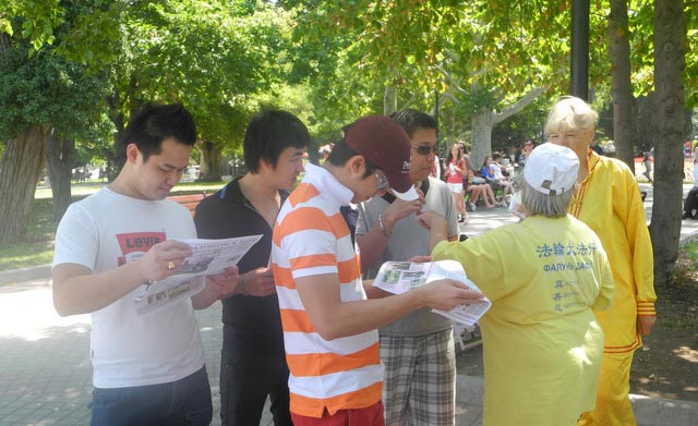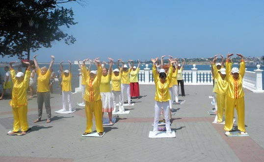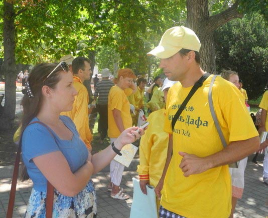 活动期间,法轮功学员演示了功法动作,还进行扇子舞、莲花舞、腰鼓等中国传统文艺表演。当天正逢乌克兰和俄罗斯重大的海军节,游客比往常增加许多。人们频频驻足观看法轮功学员的功法演示以及演出的小剧目,并拍照、录像,记录这美好的画面。当了解到这么善良祥和的修炼者在中国无辜遭受残酷迫害时,人们纷纷签名谴责中共暴行。