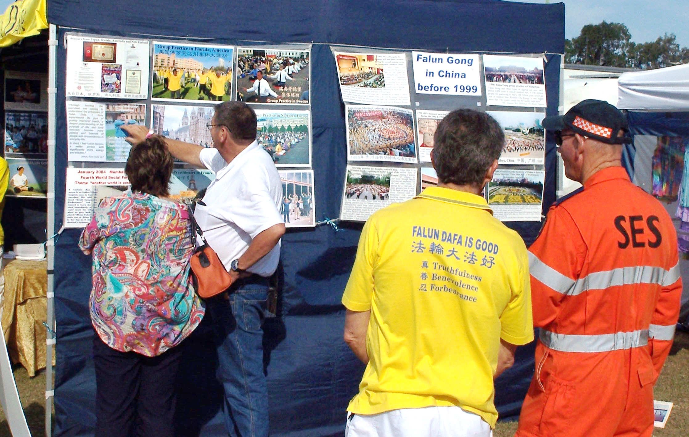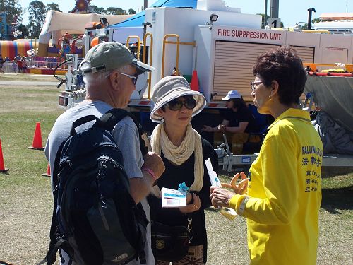 两名在现场工作的州应急服务中心(State Emergency Service, 简称SES)人员看了法轮功展位一整天,他们对中国学员遭受迫害的程度感到不可思议,并非常感谢学员告诉他们迫害的真相。
