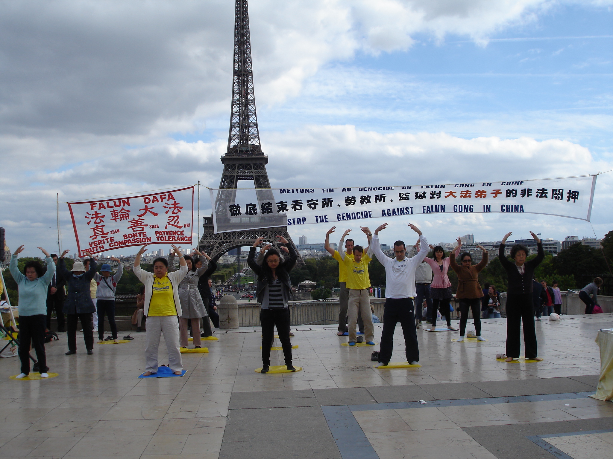 ![]() 图1:法轮功学员在巴黎埃菲尔铁塔前传播法轮功的真相。图为法轮功学员正在演示第二套功法。 |