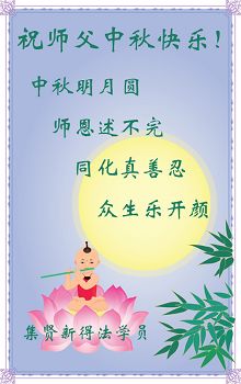 南京大法新学员遥祝师尊中秋快乐:走進大法才发现原来法轮大法就是自己一直寻觅的,在返本归真的路上时时感叹恨自己在大法洪传时没赶上,又庆幸终在正法的最后续上缘份。师父与亿万同修的付出,走过了最艰难的时期,而今自己在相对宽松的环境下,没理由不做好三件事。