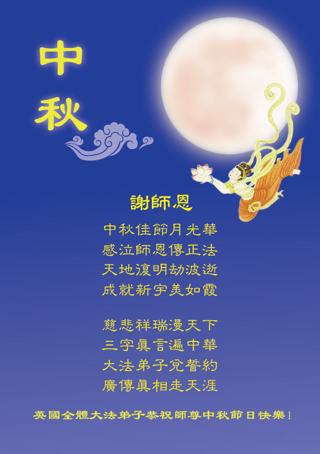 中秋节也被称作是中国人的感恩节。李洪志师父将法轮佛法传诸于世,以真、善、忍真理之光照亮亿万向善者心田,净化了弟子的身心,引领人走上返本归真之路。与往年中秋节一样,世界各地法轮大法弟子纷纷以个人、家庭的名义,或代表地区、单位、讲真相小组、学法小组,向慈悲伟大的师尊恭贺佳节,表达无尽的感恩。