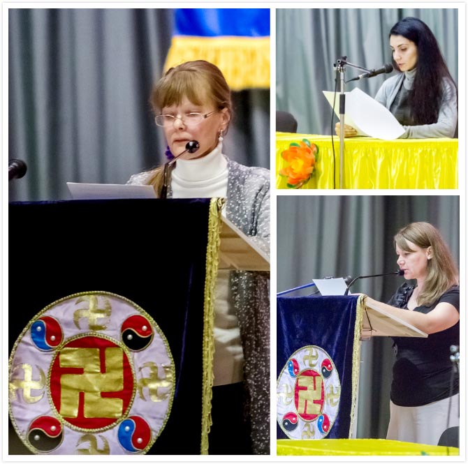 法会上,首先发言的是来自莫斯科的学员斯维达,讲述了自己这几个月来,持续参与阿尔巴特大街讲真相救人活动,在救人的过程中不断的去掉各种执着,初期和阿尔巴特大街上的其他民间艺术家发生了很多矛盾,起初认为他们是干扰,逐渐的通过做三件事,悟到这些是阿尔巴特大街上我们洪法点附近的“邻居”们,得首先给他们讲真相,他们也是要救的人,不是“干扰”。意识到这点后,认真的把讲真相的工作做到位,在讲真相救人中修炼,助师正法。现在这些“邻居们”都热心的帮助我们做讲真相的工作。