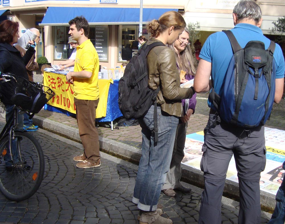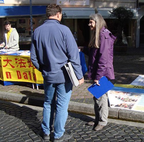 学员遇到一位德国小伙子。对方英语不够好,学员德语也不够好,俩人一时难沟通。小伙儿正犹豫是否在征签簿上签名时,过来一位先生,他说自己以前接过这位学员的真相资料并且签过名了。他还说自己仔细地看了带回家的真相资料,并查询了相关信息,对中共活摘法轮功学员器官的罪行比较清楚了,他可以讲给这位年轻人听。于是,他用德语认真地给小伙儿讲了发生在中国大陆的“活摘”罪恶。小伙儿边听边点头,最后在征签簿上签了名,诚恳地说“谢谢”。