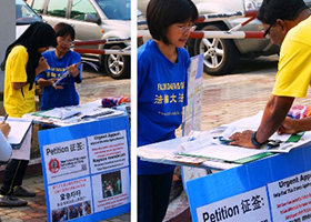 马国法轮功学员持续征签 揭露中共活摘罪行(图) 二零一三年八月三十一日,马来西亚雪兰莪州巴生法轮功学员来到当地的人民公园正门口,征集签名,持续向民众讲真相,揭露中共的邪恶迫害。