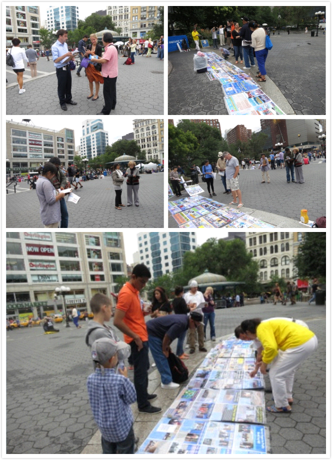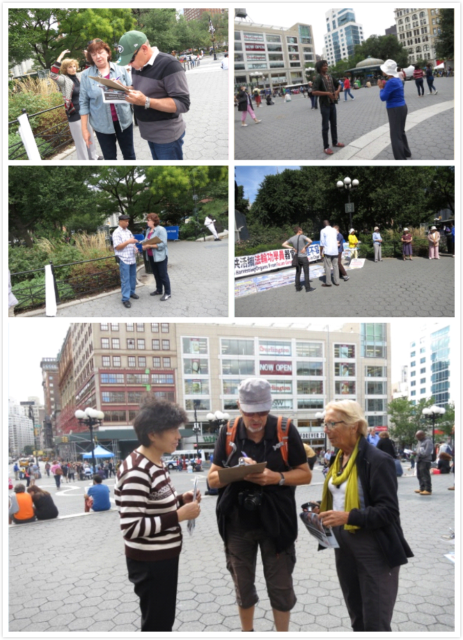 【明慧网二零一三年九月三十日】纽约部份法轮功学员自二零一三年八月以来,在纽约曼哈顿联合广场进行活动,活动主要以真相图片,面对面讲真相的形式,揭露中共活摘法轮功学员器官暴行。中共驱动全部国家机器法轮功、活摘法轮功学员器官牟利,可谓罪恶滔天,人神共怒,纽约各族裔民众听了活摘真相后,非常震惊,纷纷签名,要求立即制止这种罪恶行为。