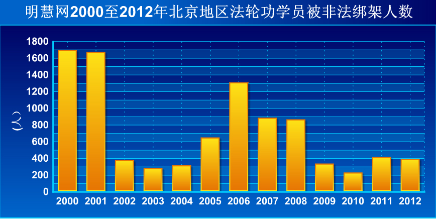 2000年至2012年北京法轮功学员被绑架人数统计: