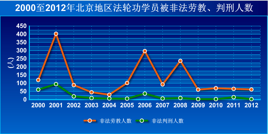 ![]() 图 明慧网2000至2012年北京地区法轮功学员被非法劳教、判刑人数 |