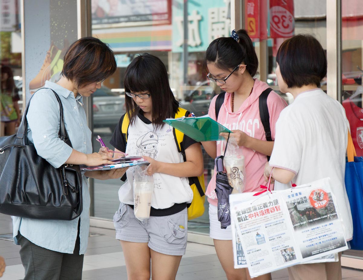 一位女士借好公用脚踏车,好象急着要离开,看到征签就停下来问是怎回事,当她听明白真相,二话不说,立刻把脚踏车停好,工工整整地签下自己的名字,并祝连署人数很多,发挥强大正义力量。一对老年夫妇听完真相连署后,也主动去叫来在购物的孩子过来连署,祈愿迫害马上停止。