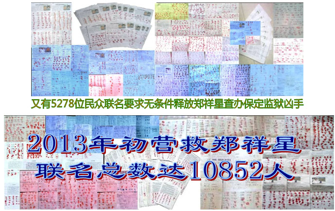 中共及保定监狱迫害郑祥星的这一系列暴行不断传到郑祥星的家乡及周边地区,引起民众的广泛愤慨,联名支持法轮功,要求释放郑祥星的民众持续不断。继二零一三年三月二十六日明慧网已经在明慧网发表的10852手印(详见明慧网二零一三年三月二十六日报道《营救郑祥星 河北万人联名签字按手印》)之后,又有5278民众联名摁红手印要求追查迫害郑祥星的凶手,无条件释放郑祥星,目前联名声援郑祥星的总人数已达16130人。随着法轮功学员不断揭露中共及保定监狱对郑祥星的迫害,各地联名还在不断继续。