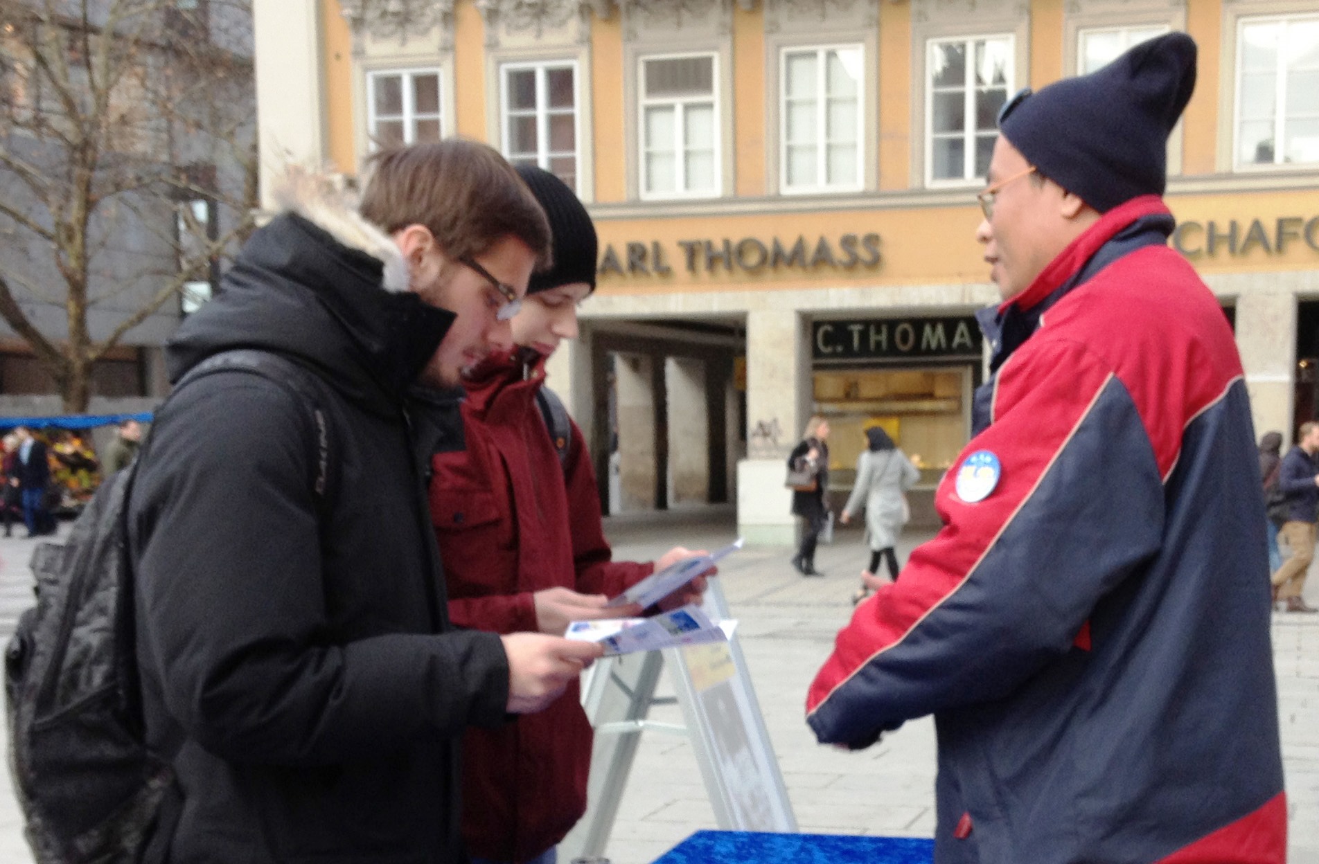 适逢慕尼黑举办“国际体育冬季用品展”,很多大陆展商在市中心浏览,不少人纷纷留影并接过资料,也有华人当场表示退出中共各种组织。