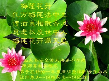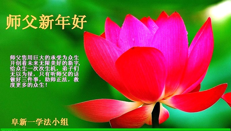 我们夫妻是09年得法的新学员,虽然我们俩在不同环境,但跟师父回家的心是一样的。在新的一年里学好法,做好三件事,修好自己,让师父少操点心,争取赶上正法進程,跟师父回家。我们夫妻跪拜:祝师尊新年快乐!