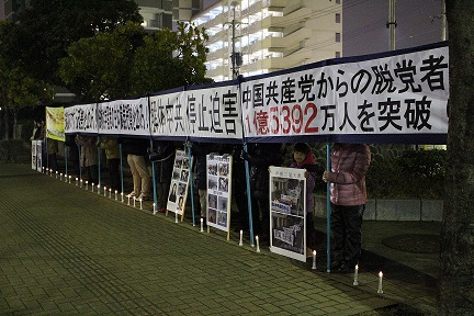 三十一日下午三点到深夜一点,福冈、佐贺、熊本等地区的部份法轮功学员牺牲自己与家人团圆的时间,分别来到长崎和福冈中领馆前,打开反迫害横幅和展板,用烛光守夜方式悼念在中国大陆被中共邪*党-迫害致死的无辜的法轮功学员,并呼吁制止中共对法轮功长达十四年多的残酷迫害。