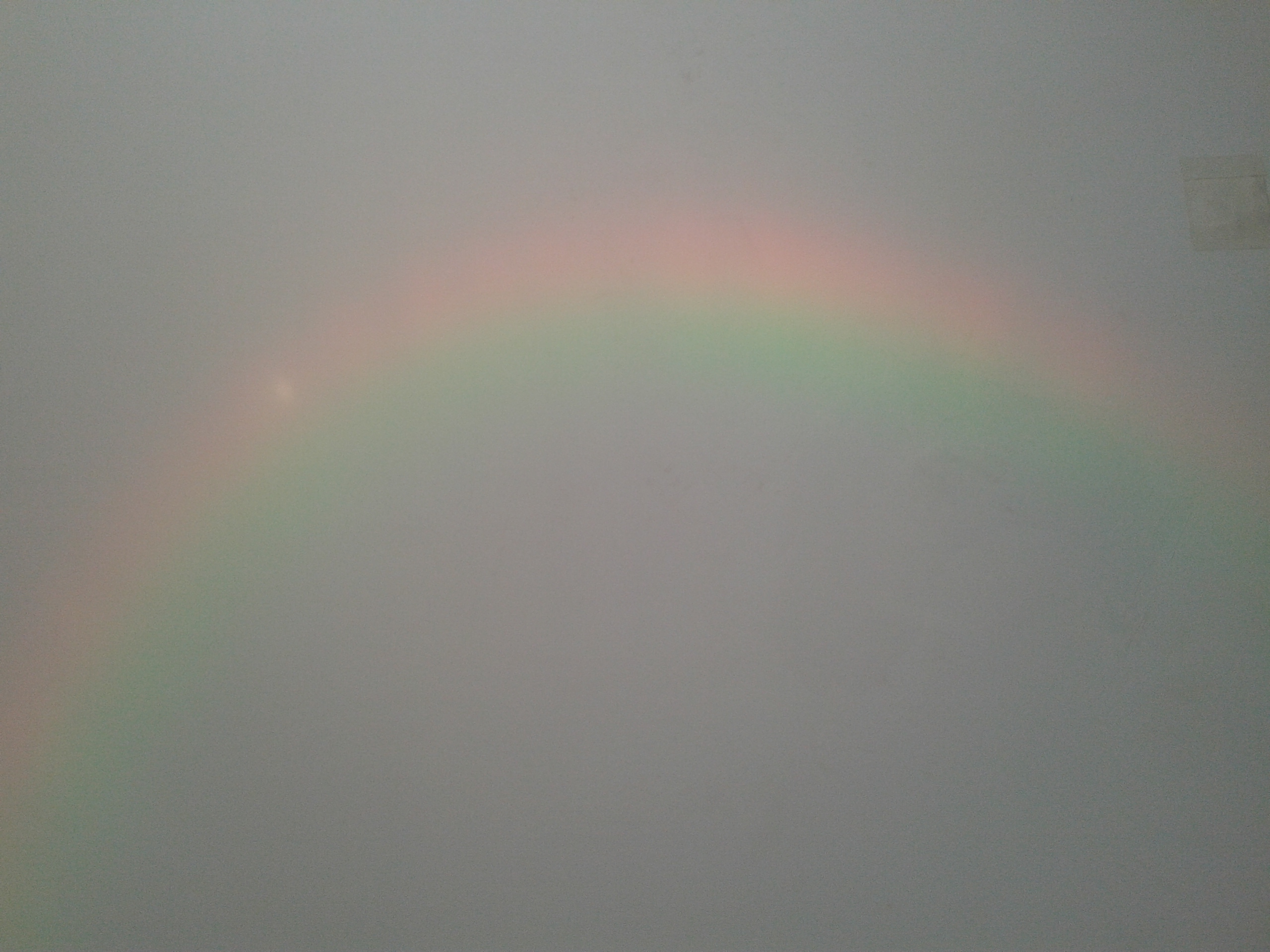 二零一三年十一月十四日这天,我们几位同修不约而同的去A同修家送条幅。一進屋,先来的同修说:“正等着你呢,快看!”他们指着白墙上映出的一道彩虹。我惊喜的看到雪白的墙上有一道鲜艳的五彩缤纷的彩虹,同修告诉我,这彩虹已呈现有五、六分钟了,我幸运的看到了最后几分钟。一位同修隐约看到师父的法身来了,原来这彩虹是师父法身带来的光圈。这光圈象蓝天上挂着的彩虹。