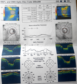 配镜三个月后,洪洪告诉我,他坐在第一排都看不见黑板上的字。这时老师也打电话来说,我家小孩上课总是开小差。我一听心想:看不见黑板肯定上课要分心。于是二零一二年五月,我们再次来到华西医院進行检查,一检查吓一跳,医生告诉我:“你家小孩的眼睛验光,三百度也只能看到零点八,二百度也是零点八,度数上不去。你带他做一个全面的检查。”于是我们让医生做了全面的检查,下面这些就是当时做眼部OCT时照出来的图片:
