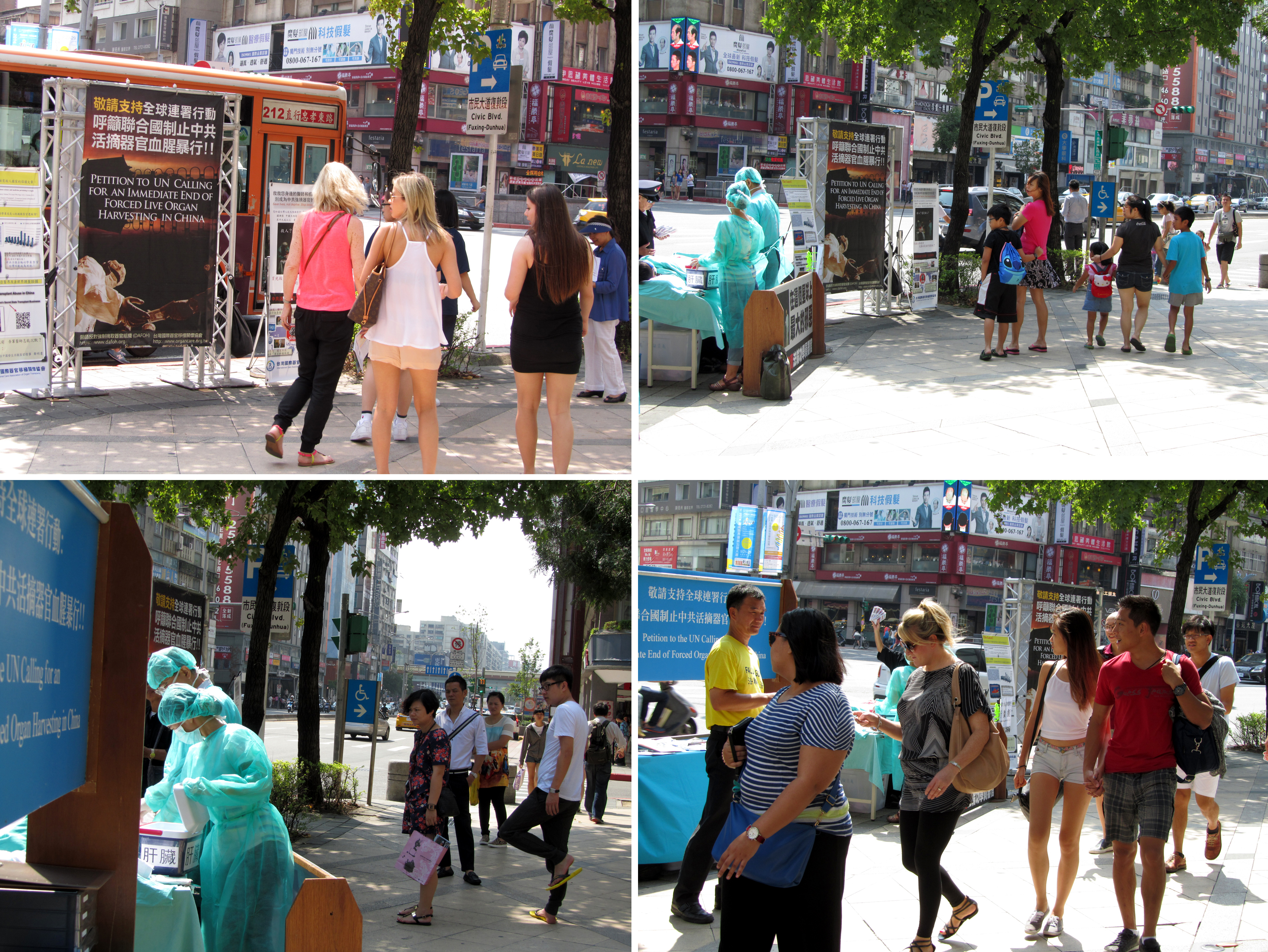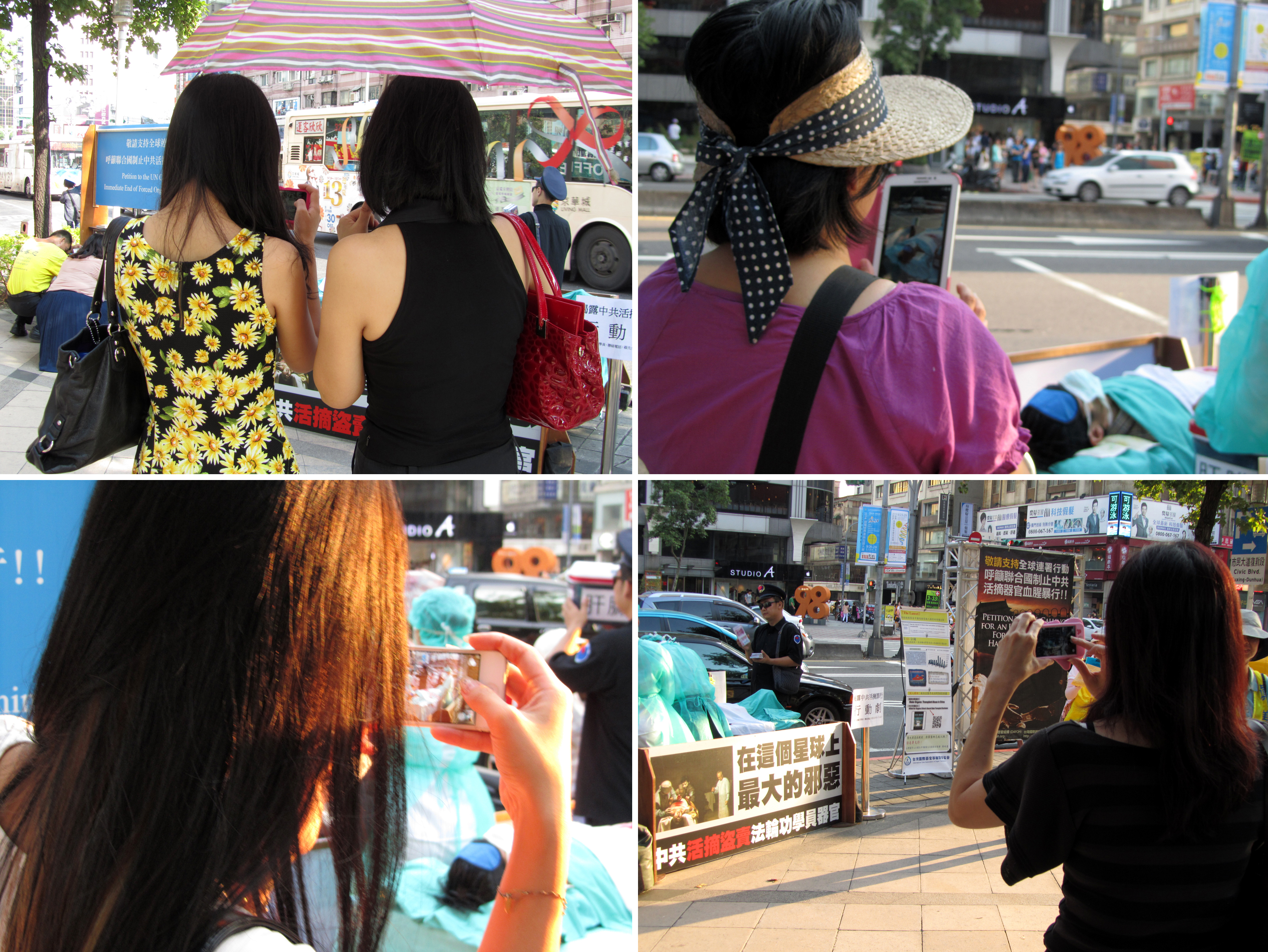 现场的真人模拟演示以及“揭露中共活摘暴行”、“制止中共迫害法轮功”、“法办江泽民、罗干、刘京、周永康”,和“呼吁支持全球联署制止中共活摘器官血腥暴行”的展板,吸引车上乘客、摩托车骑士以及熙来攘往的民众聚焦注目,有的拿起手机、相机拍摄画面,有的驻足观看、拿取真相资料,聆听学员讲解。