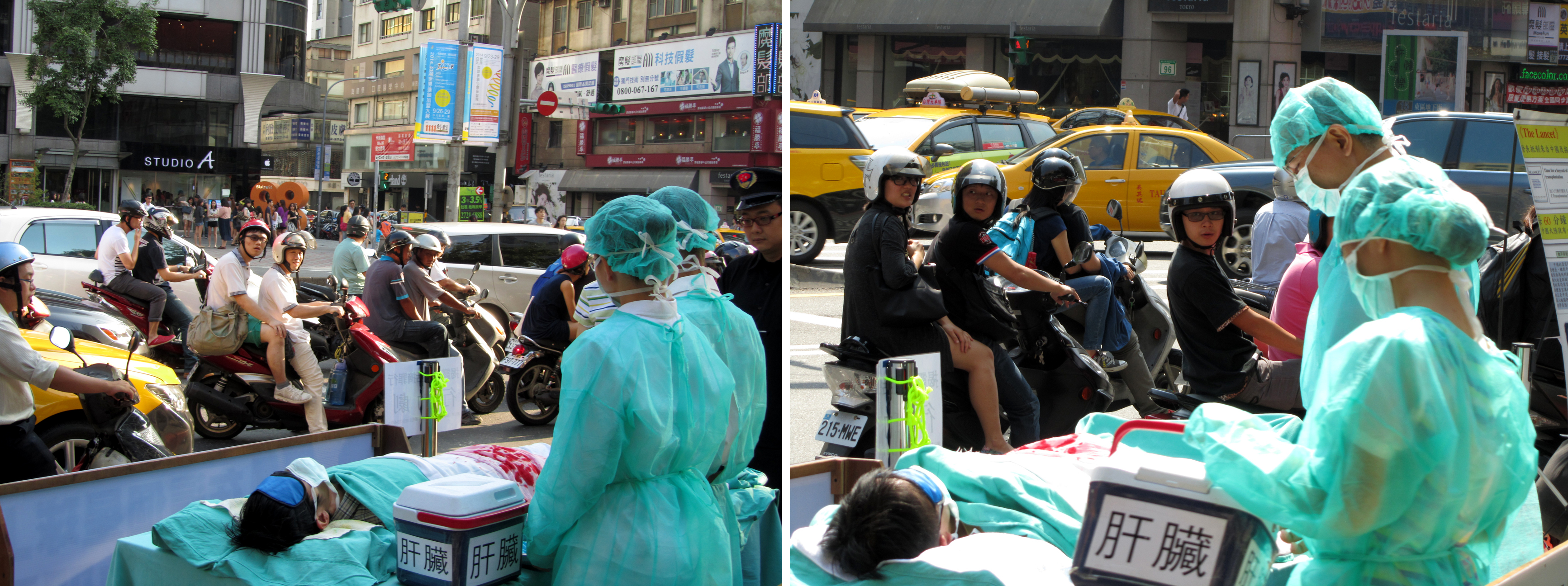 ![]() 图2-3:车上乘客、摩托车骑士以及来往的民众,看到“中共活摘法轮功学员器官”的模拟演示,感到震惊与关切。 |